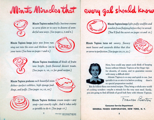 MIRACLES WITH MINUTE TAPIOCA Vintage Recipe Booklet Compiled by Frances Barton Published by General Foods Corporation ©1948