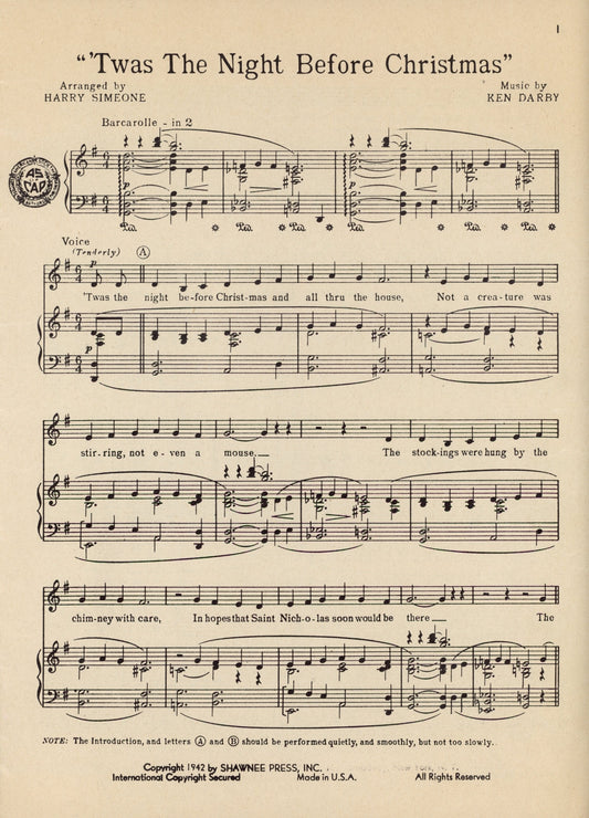 TWAS THE NIGHT BEFORE CHRISTMAS Vintage Sheet Music Published by Shawnee Press ©1942