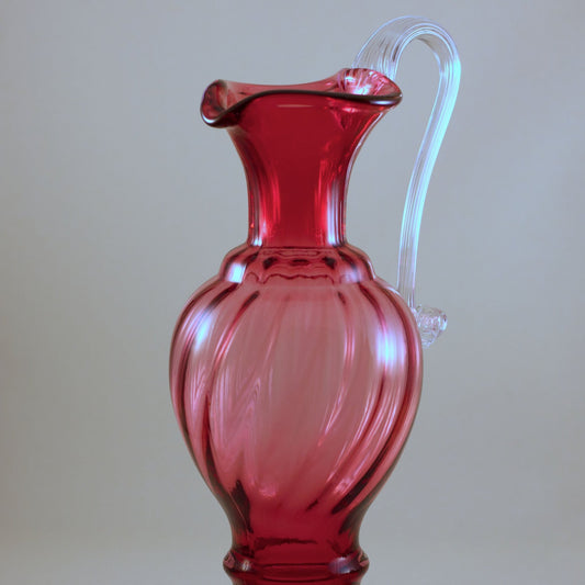 FENTON CRANBERRY GLASS Footed Claret Jug with Fancy Applied Reed Design Handle Circa 1990s