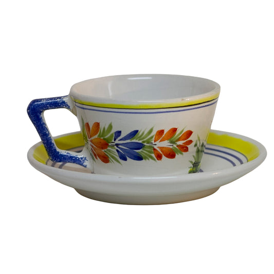 HB Quimper Faïence Flat Cup, Soleil Yellow, Hand-Painted Breton Figure, France c. 1940–1960