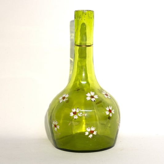 VICTORIAN ENAMELED BARBER BOTTLE Apple Green Colored Glass with Gold Gilt and Hand Painted White Enamel Daisies Circa 1880-1910