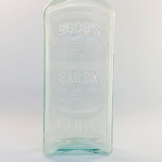 HOOD'S SARSAPARILLA APOTHECARIES Aqua Glass Bottle Lowell Massachusetts Circa 1878 - 1922