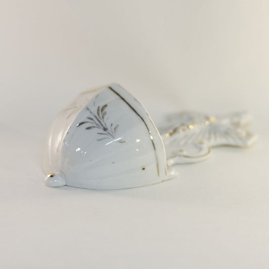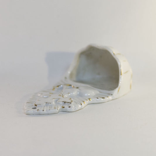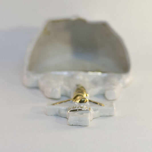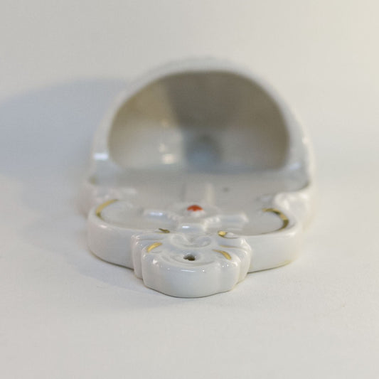 HOLY WATER FONT Depicting SACRED HEART, CROSS and CHAINS White Glazed Bisque with Hand-Painted Gold Gilt