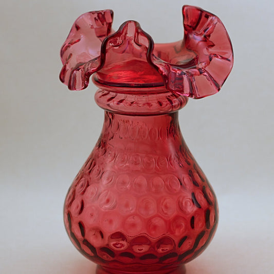 FENTON CRANBERRY ART GLASS Two-Ring Vase with Ruffled Edge in Ruby Overlay & Polka Dot Pattern Circa 1950s
