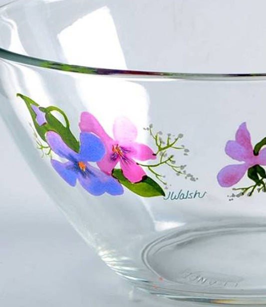 Wild Violets glassware was custom designed for Avon in the early 1980s. The design combined the beauty of spring violets with the elegance of 24K gold permanently fired into the glassware colors. Each piece was hand painted with purple and pink violets with green leaves, signed J. Walsh, and stamped FRANCE.