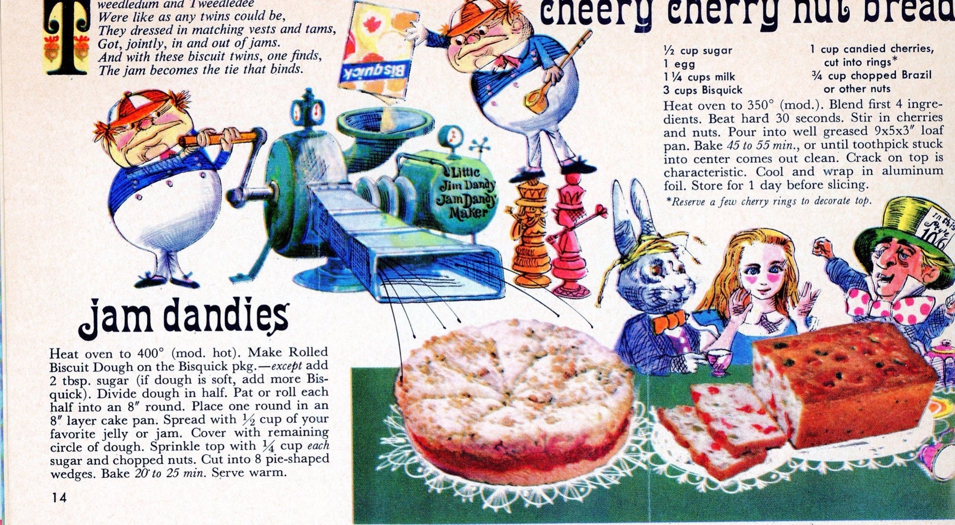 The contents of the 20-page pamphlet includes cookie, pie, quick bread, cake, yeast bread and snack recipes. All the recipes are based on a children's story book characters and have catchy names like Sugar Plum Dreams, Good Fairy Cookies, Silver Bells and Cockleshells, Camelot Cookies, Flaming Mince Pie, Jam Dandies, Jack-Be-Nimble Date Cake, Tiny Tims and Mr. Pickwicks. It is filled with fantastic colorful illustrations mixed with color photographs that depict the recipe name.