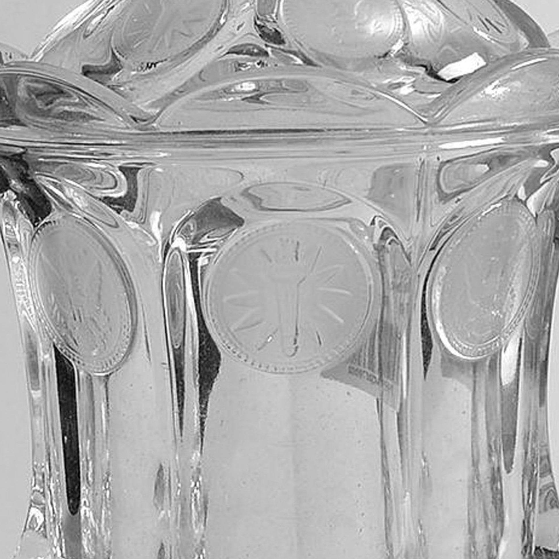 The eagle and freedom torch coin emblems on the piece are frosted, a mark that the piece is original Fostoria. The eagle emblem is dated 1887.  The coin emblems on later coin glass made by Lancaster Glass were not frosted.