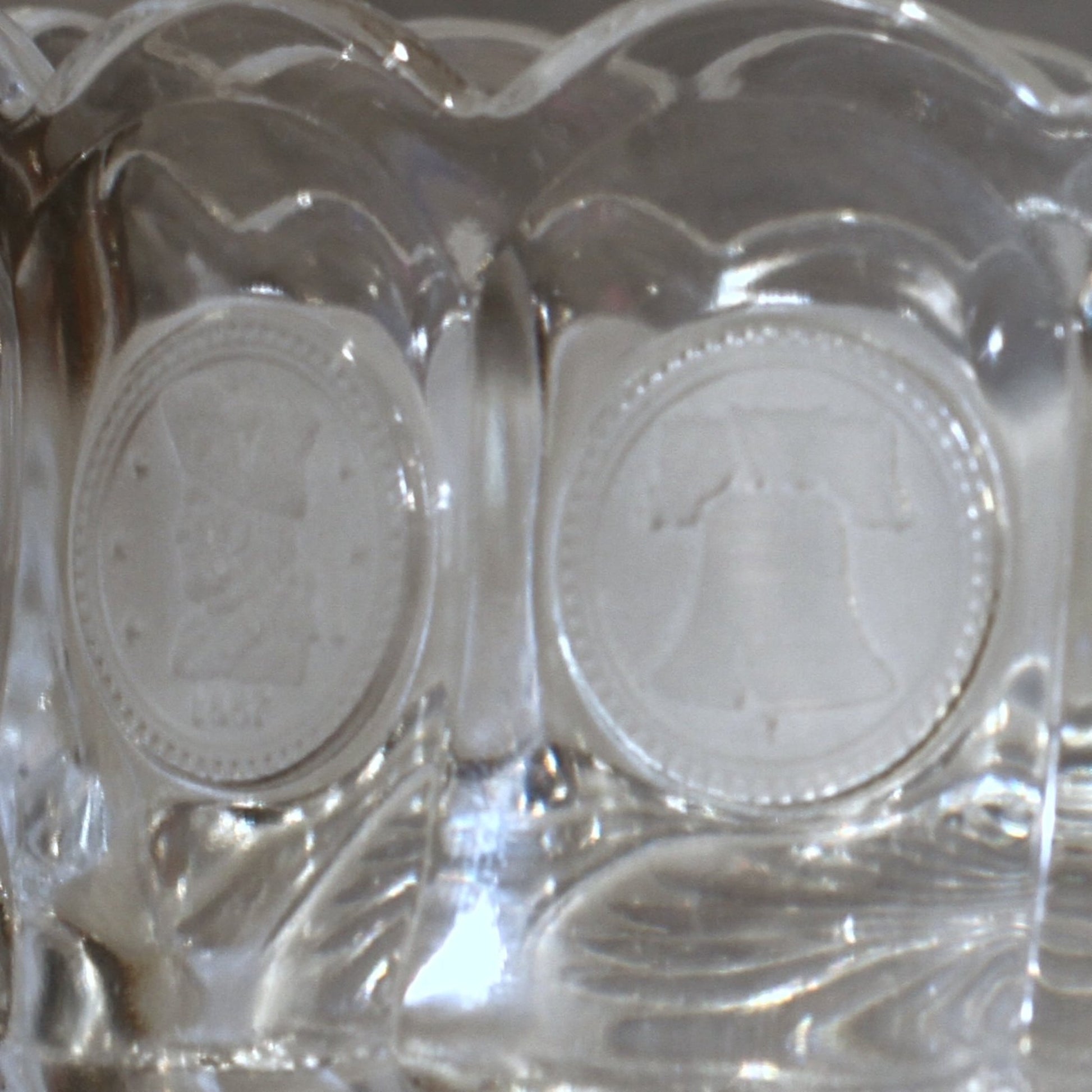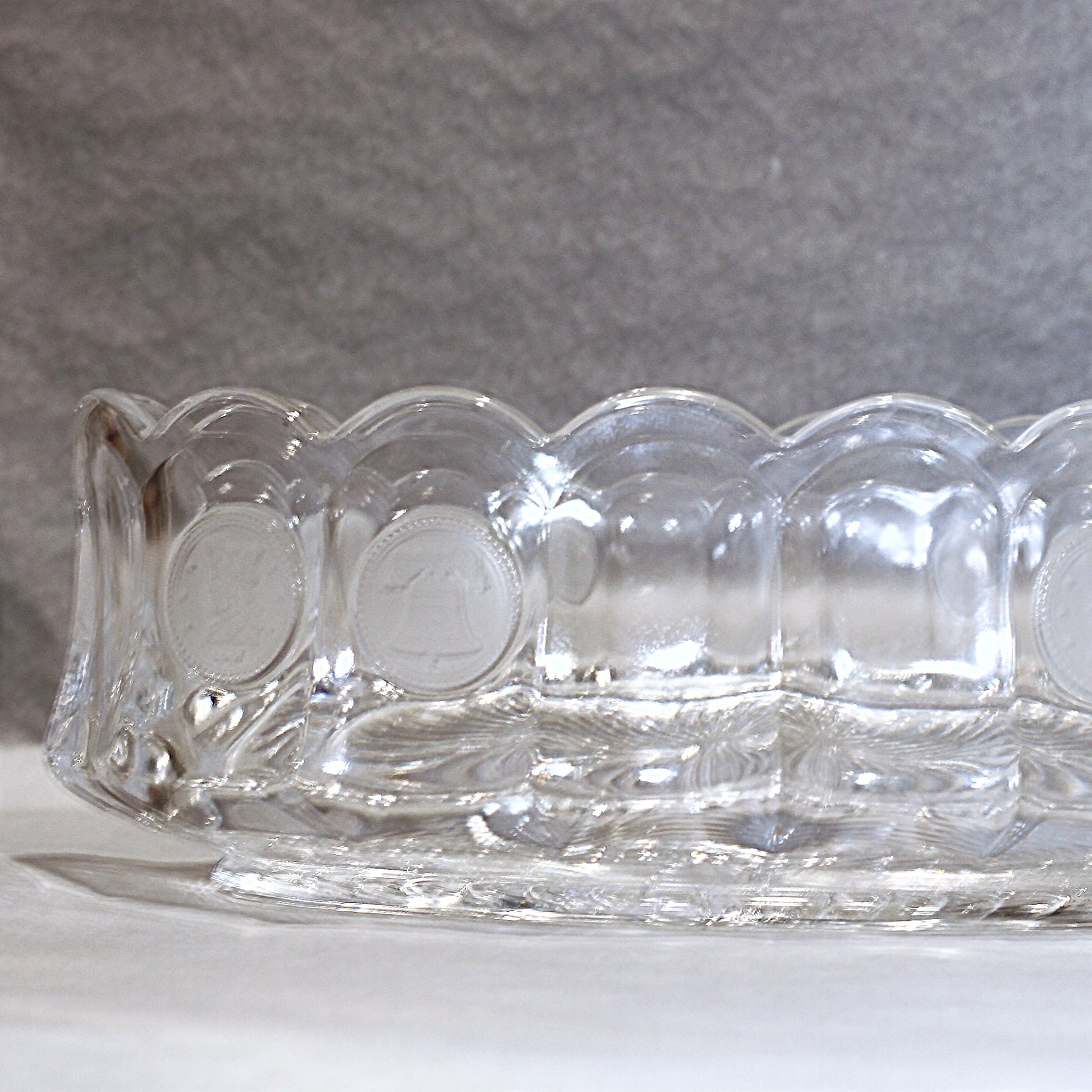 The CLEAR OVAL BOWL measures approximately 3¼” high x 5¼” wide x 8 ⅞” long. It is in excellent condition and is crystal clear.The Liberty Bell and Revolutionary Wall Soldier Head coin emblems on the piece are frosted, a mark that the piece is original Fostoria. The soldier emblem is dated 1887. (The coin emblems on later coin glass made by Lancaster Glass were not frosted). The piece set is heavy, weighing a little over 2 pounds.