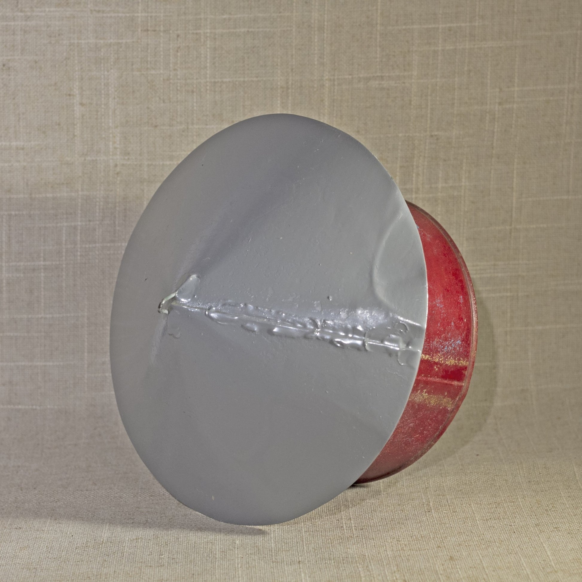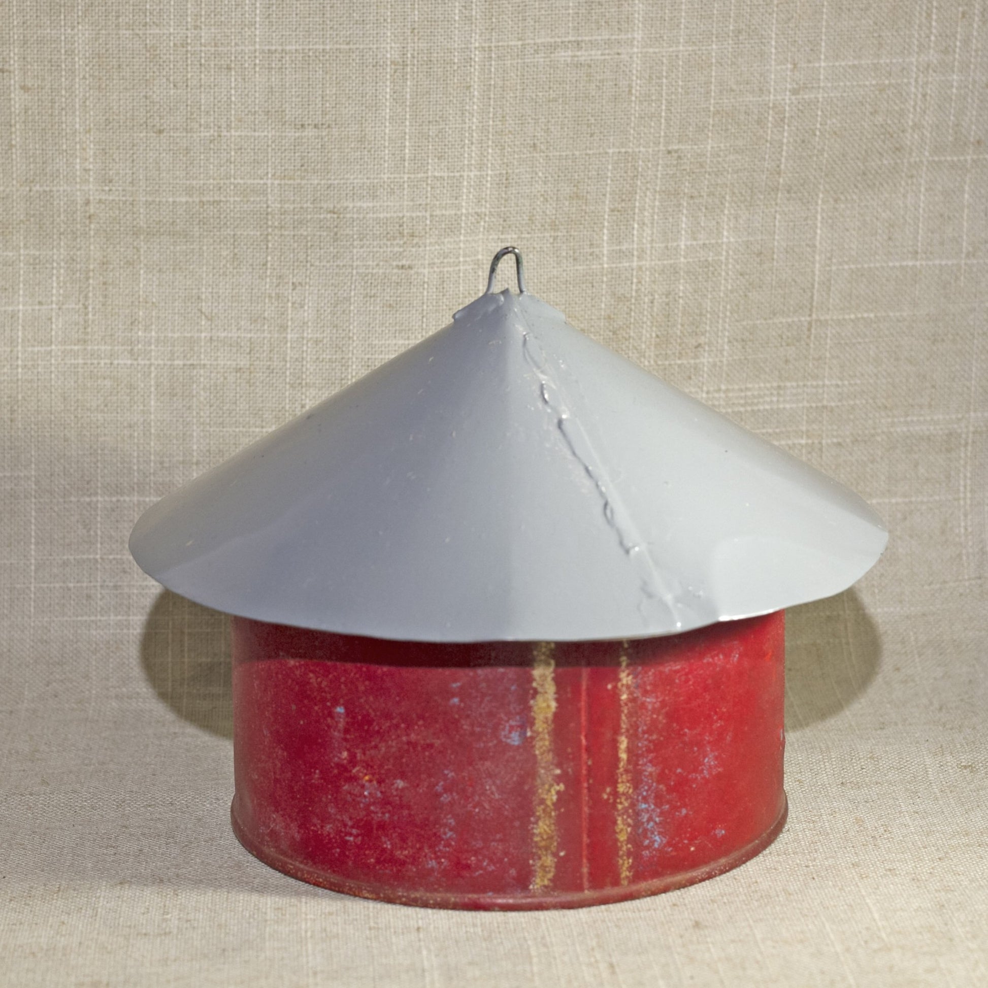 The scarlet red coffee can base measures approximately 5” across by 3 ¼” high. With the conical gray roof, the entire birdhouse measures about 7” across by 5” high. The perch is designed using a small dowel stick.