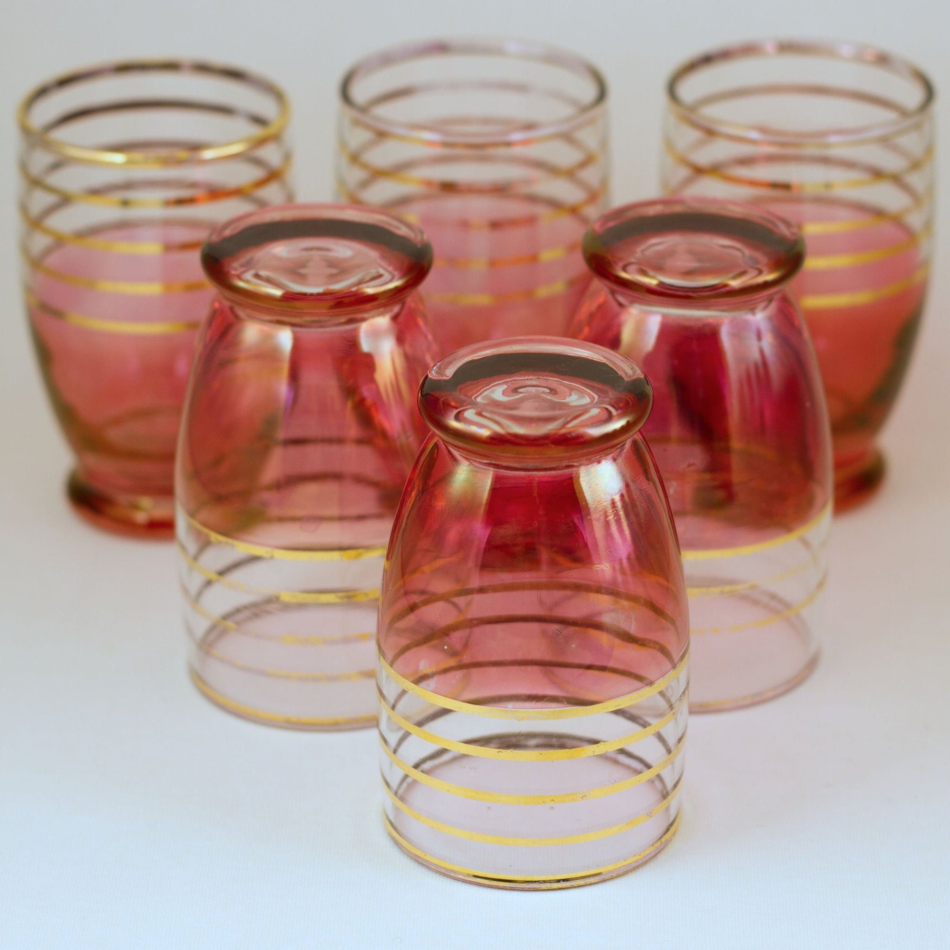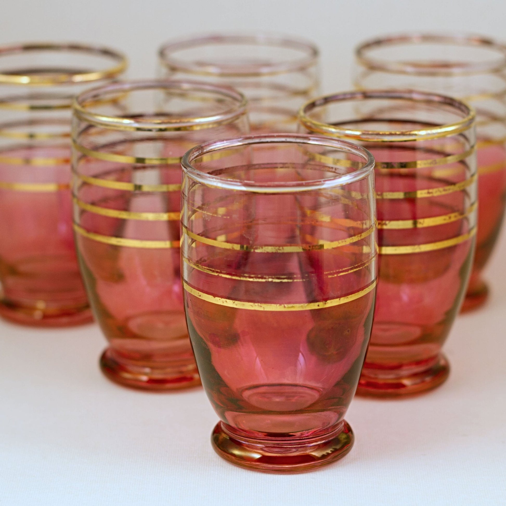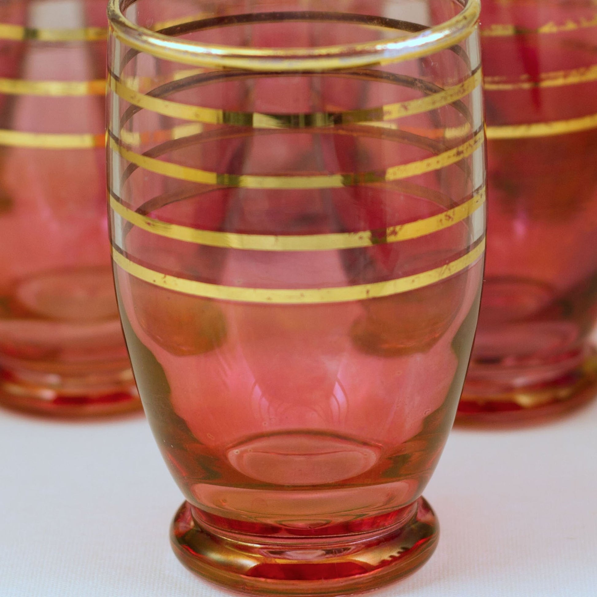 CRANBERRY GLASS Juice Tumblers with Gold Stripes (Set of 6)