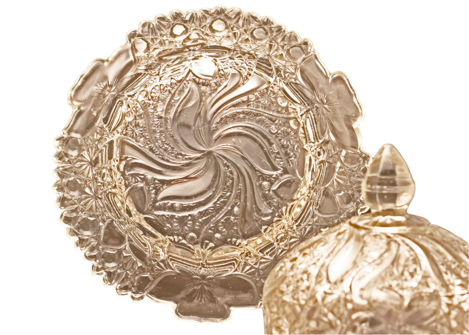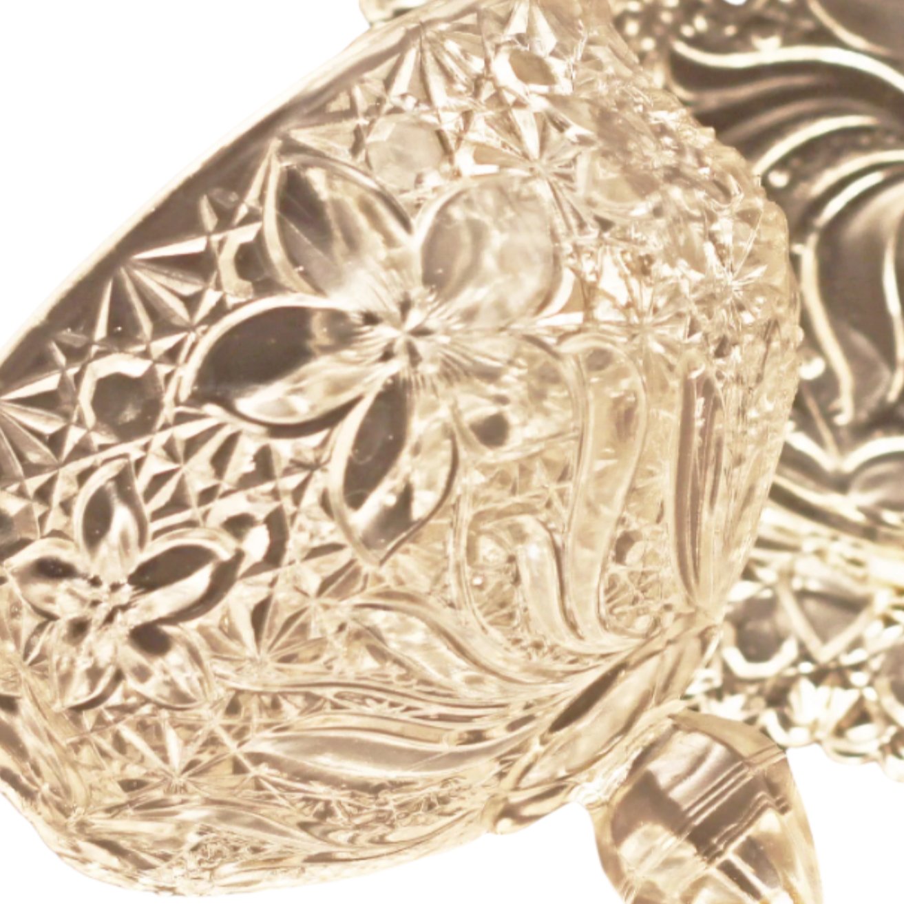 The intricate floral design adorns both the domed cover and base of this 7 ⅛” wide dish, standing at an impressive height of 5 ¾”. The glass remains remarkably clear with no signs of yellowing or discoloration. This two-piece set is in excellent condition, devoid of any chips, cracks, or other forms of damage.