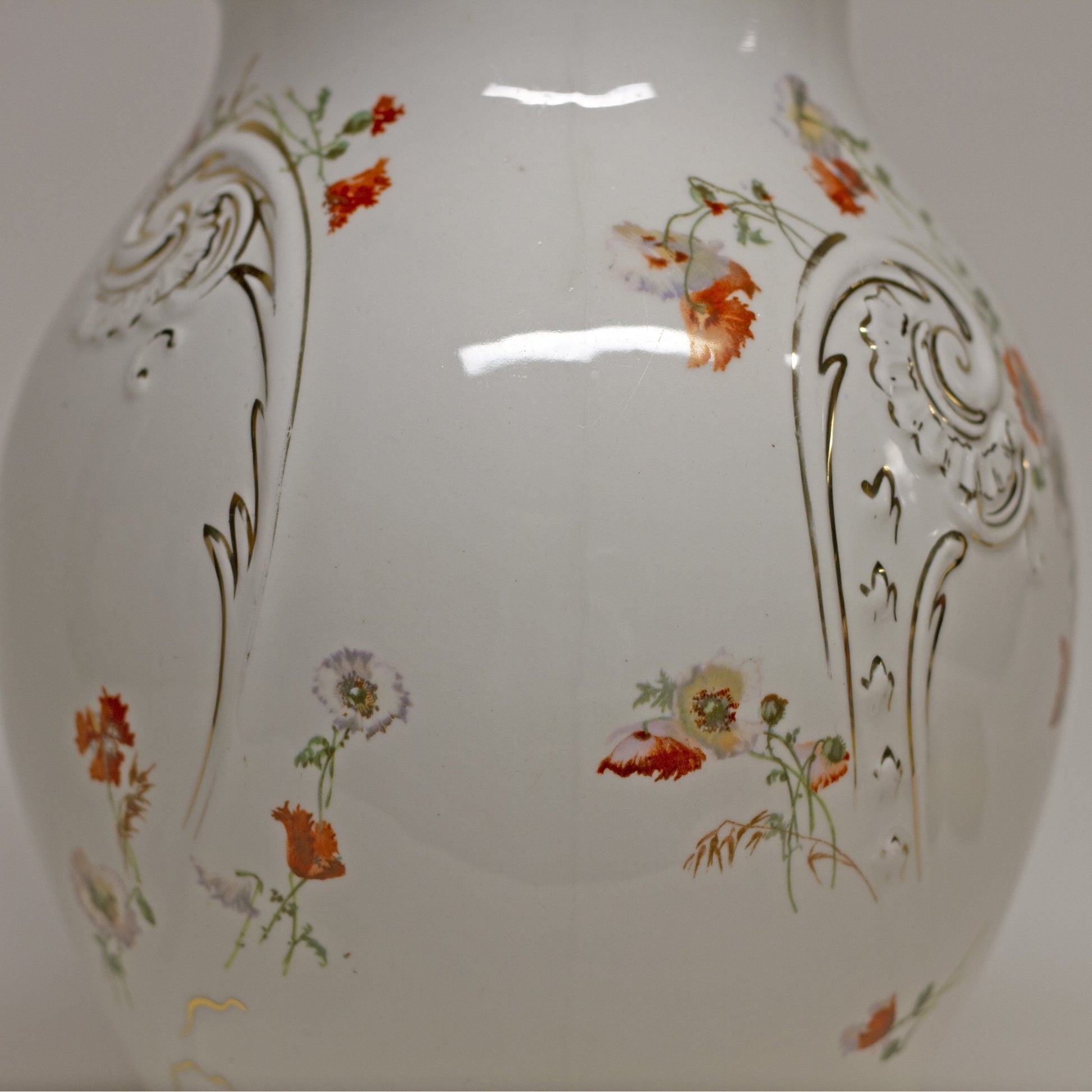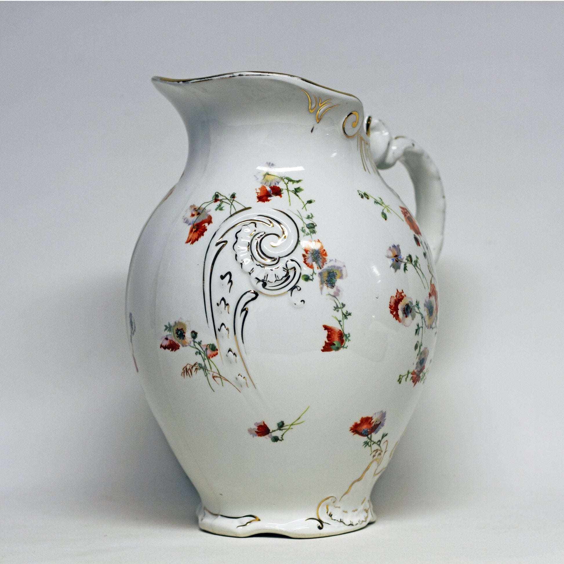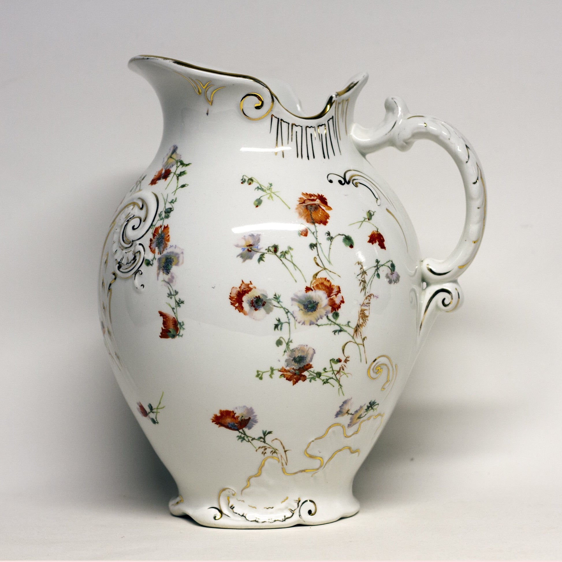 The large water pitcher or jug is beautifully decorated with reddish orange, pink and purple taupe poppy flowers, raised embossed large filigree designs and gold gilt accents.