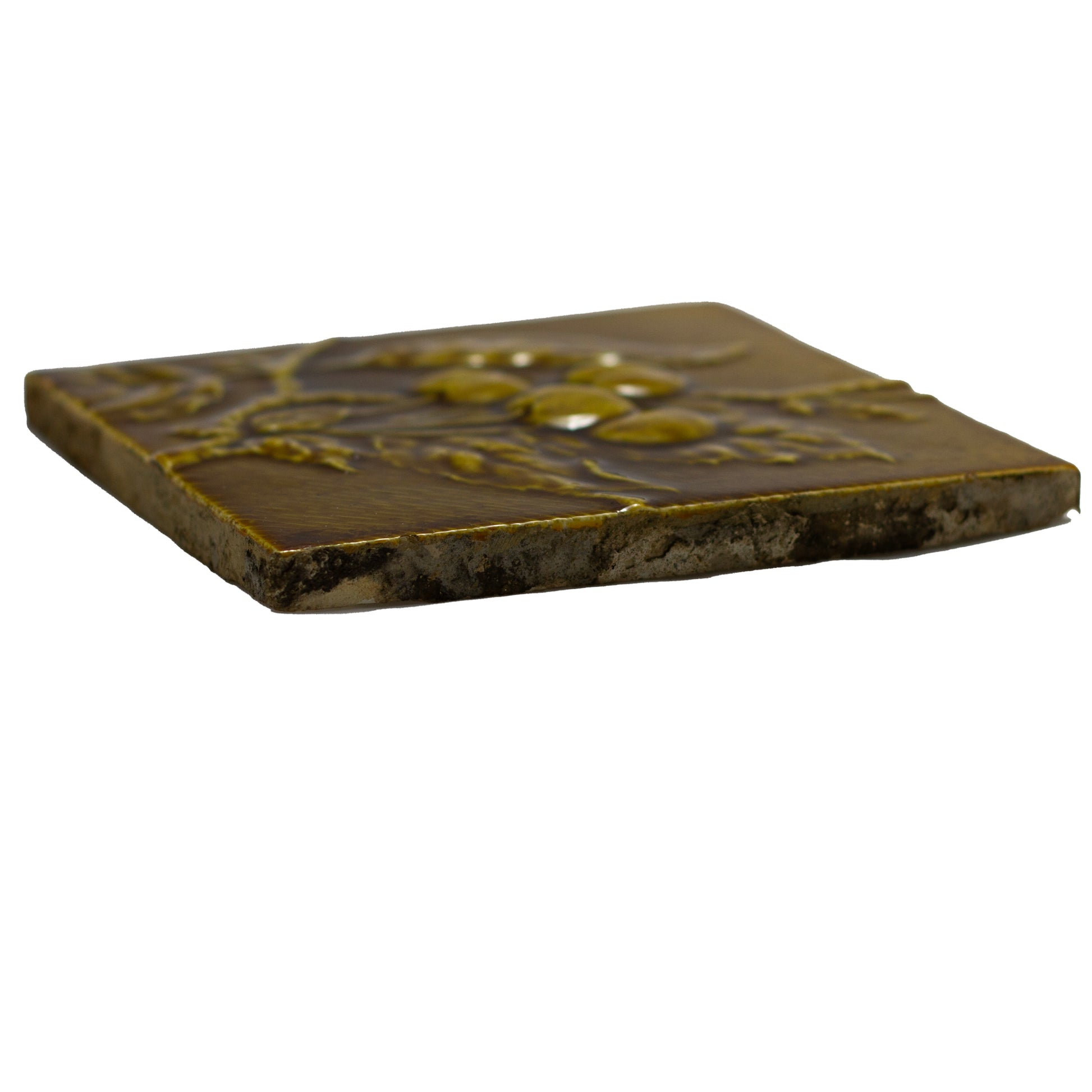 Very good condition for salvaged art tiles. Tile fronts demonstrate excellent glaze preservation, strong relief, and minor expected wear. The backs show mortar and residue consistent with removal from their original fireplace setting. No cracks but the sides of the tile with "branches and leaves" are chipped from the salvage process. The chips do not show from the front of the tile.