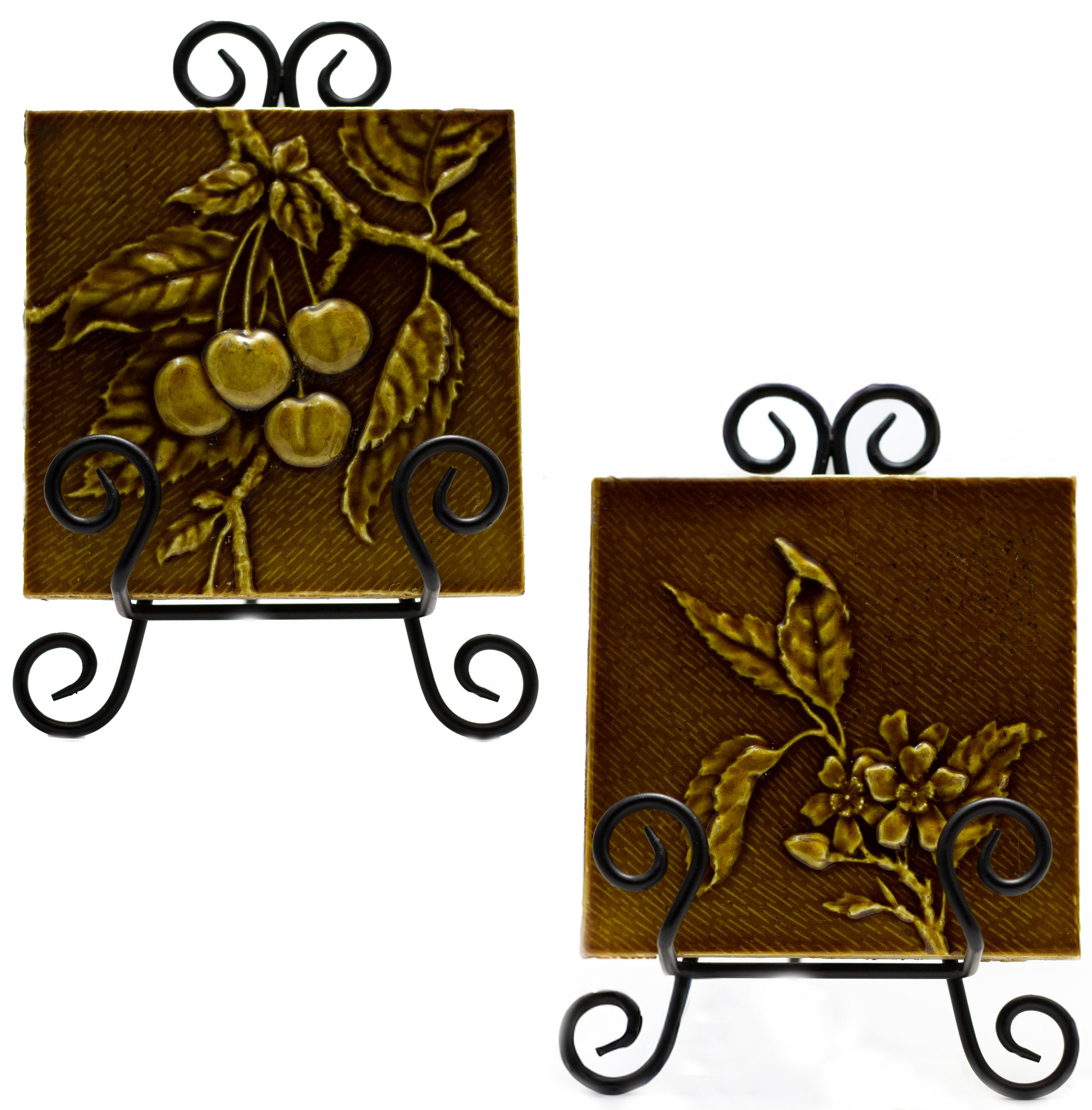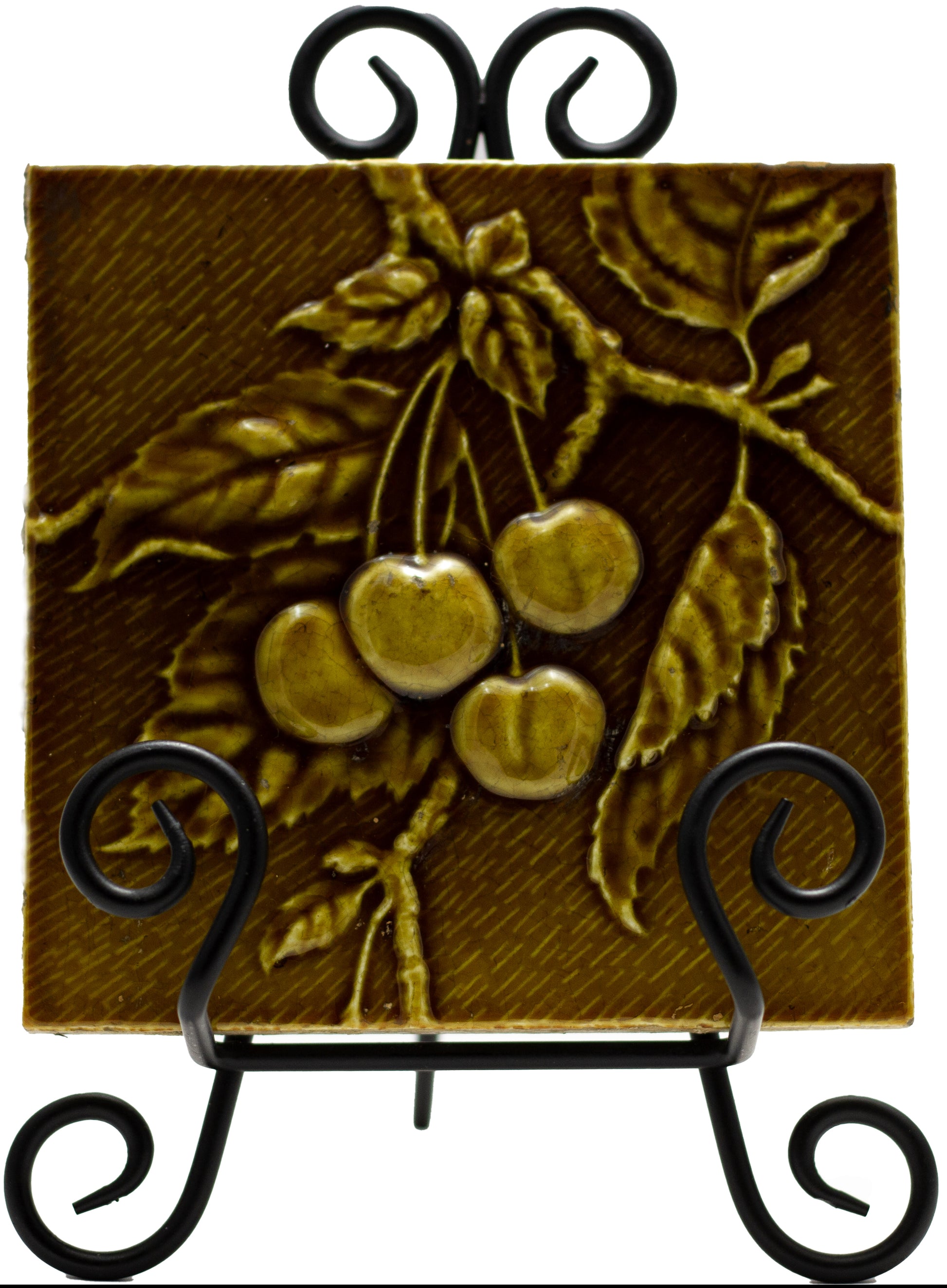 Offered here is a matched pair of original embossed Victorian art tiles produced by the U.S. Encaustic Tile Works of Indianapolis, one of America’s premier tile manufacturers of the late 19th century. These richly glazed relief tiles feature naturalistic cherry fruit and blossoming branch motifs, executed in a warm olive-brown glaze that emphasizes the depth of the modeling.
