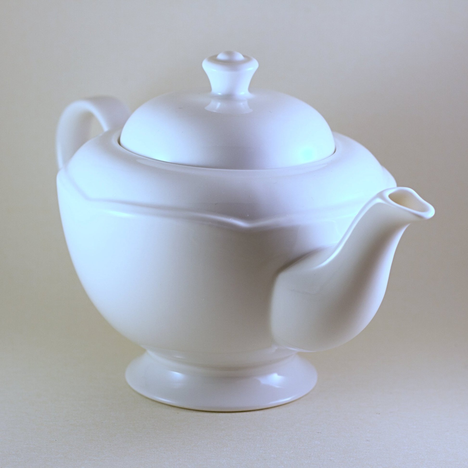 The beautiful set consisting of a teapot, covered sugar bowl, and creamer was by Johnson Brothers of Staffordshire, England and discontinued in 1994. The all-white pattern is scalloped and called London White. The lids for the teapot and sugar bowl have a button top.