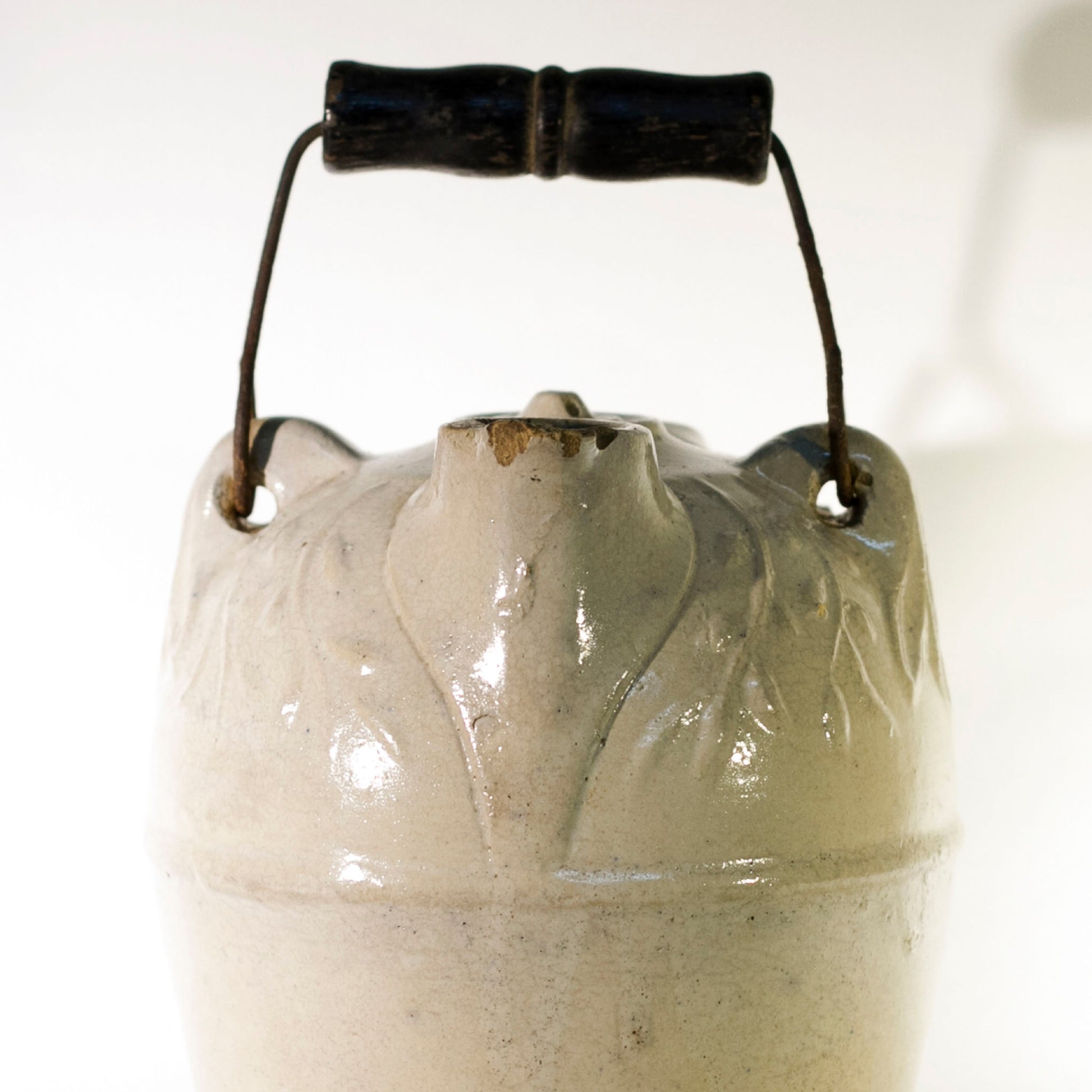 It has a decorative flair with embossed vines and leaves and an attached wire bail with a black wood handle. It is a very good condition other than a chip on the spout with expected crazing due to age. The following mark is embossed on the base: