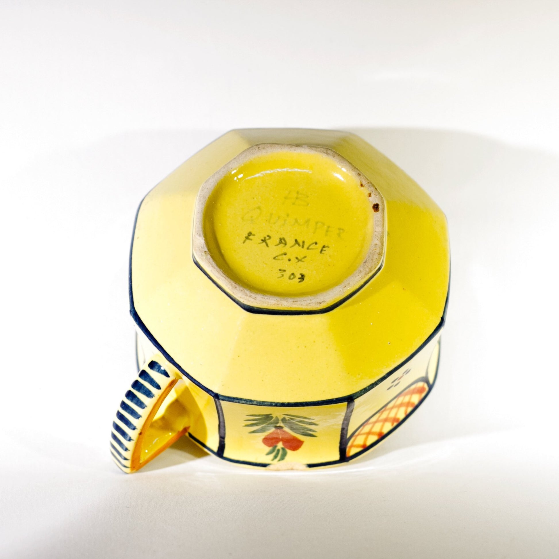 The base of the FLAT CUP is marked HB / QUIMPER / FRANCE / C. X. / 303 dating the piece between 1940 and 1960. The number 303 is the décor number, while the C designates the head of the studio, and X the painter. The yellow glazed FLAT CUP features a male Breton peasant and flowers shaped as hearts. The piece is beautiful and the colors gorgeous. It is in good condition other than an ½” wide chip on the side of the rim.