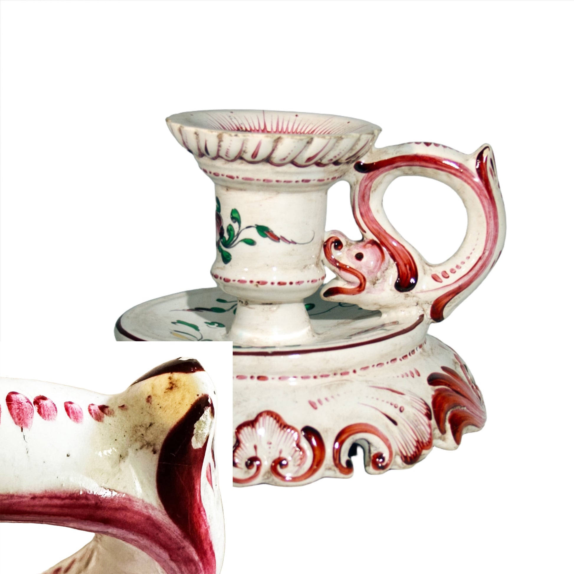 The scrolling curves design is intricately ornamental, featuring a scalloped sconce rim adorned with a "combed" pattern. The capital and shoulder are decorated with reddish pink flowers and bright green leaves, while the scalloped base boasts a raised shell and filagree design. The tip of the handle, which connects to the capital, is reminiscent of an open fish or dragon mouth.