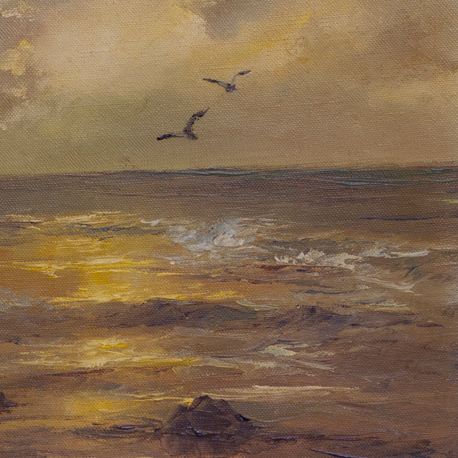 Grigorov primarily used oils in muted shades of brown and taupe with a touch of ochre for the painting. The sky features seagulls in flight above the frothy waves of the sea. Note: On a computer screen, the images may reflect more ochre yellow--but the actual artwork has more tones of brown than ochre. The painting is not framed and measures 8" x 10." The painting is in very good original condition with no visible paint loss or canvas punctures. The artist signature, G. Grigorov is in the lower left corner.