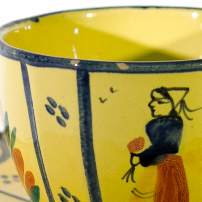 The yellow glazed TEACUP features a Breton peasant girl and heart shaped flowers. The OCTAGONAL SHAPED SAUCER features the same flower motif. The set is beautiful and the colors are gorgeous. It is in great condition other than a few small nicks in the rim of the teacup.