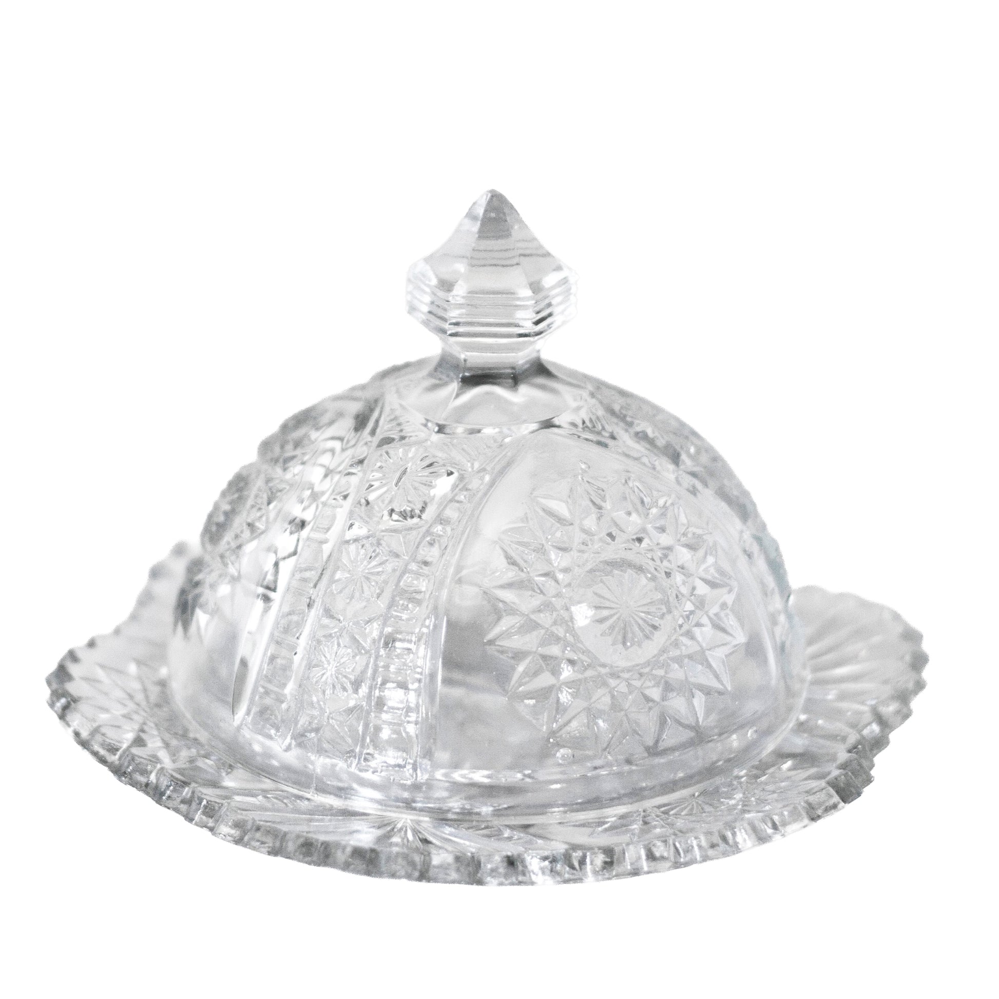 The pattern is designed with a collection of hobstars, ladders and notches motifs--and according to the Early American Pattern Glass Society, all pieces in this pattern were designed for children, with the CHILD'S ROUND BUTTER DISH & DOMED LID sold as part of a child's tea set.