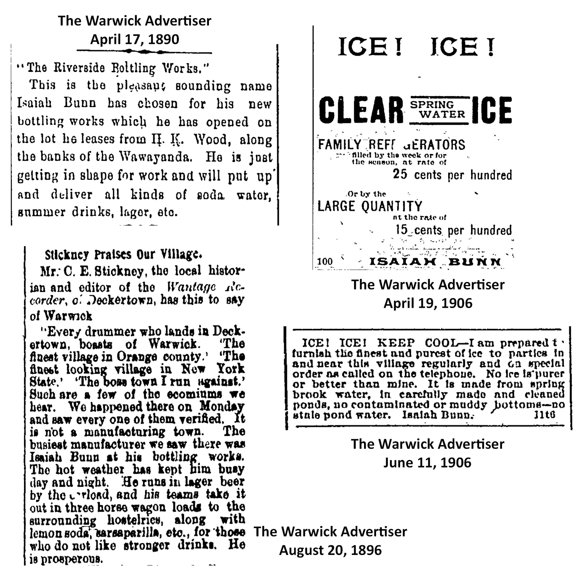 The Isaiah Bunn Riverside Bottling Works was founded in April 1890 by Isaiah Bunn. He opened his new bottling works on the banks of the Wawayanda River and "put up" and delivered all kinds soda water, summer drinks, and lager.