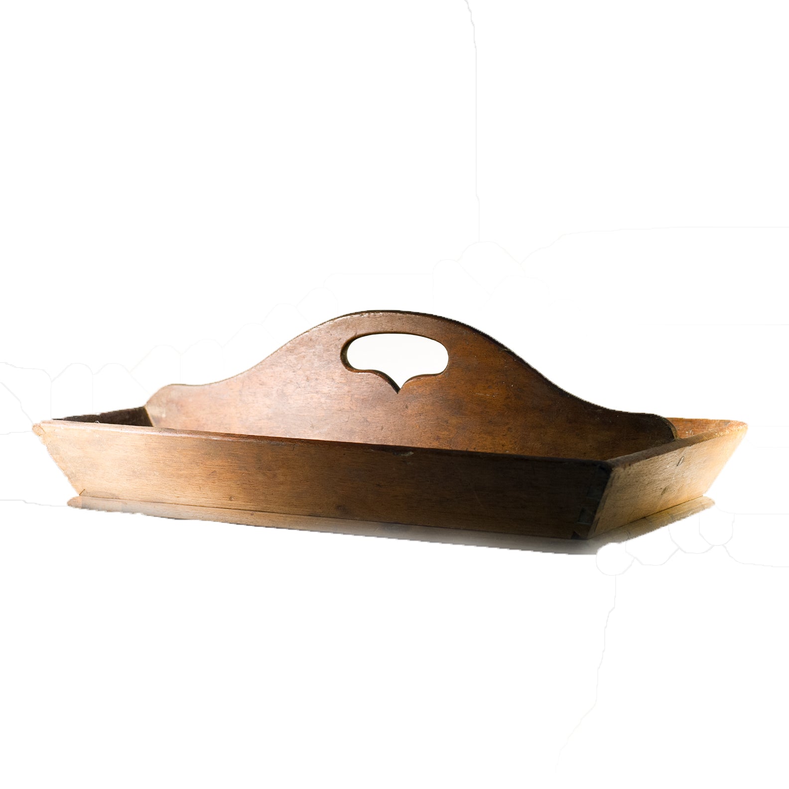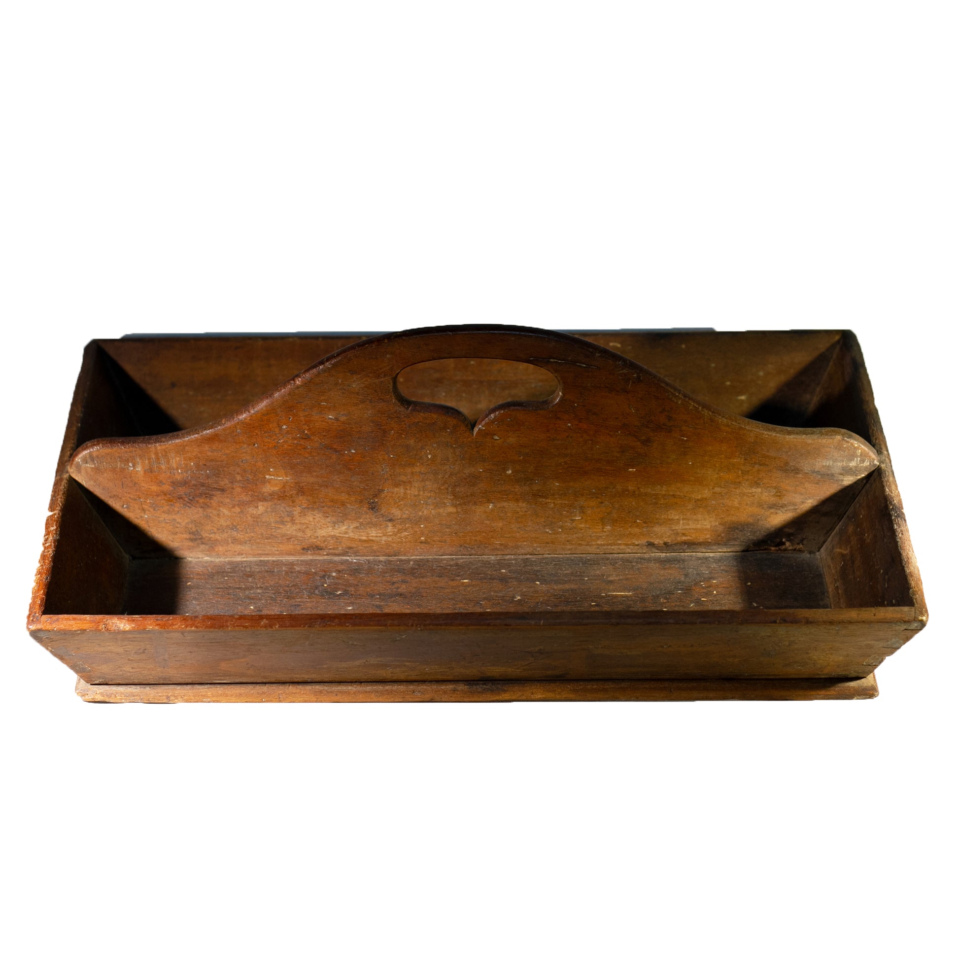 Featuring a late 19th century ANTIQUE WOODEN CUTLERY TRAY. The charming tray is large, measuring 16" across by 10 ¼” wide. The joints are dovetailed and wooden pegs attach the handle to the tray. A heart cut-out used for carrying, decorates the handle.