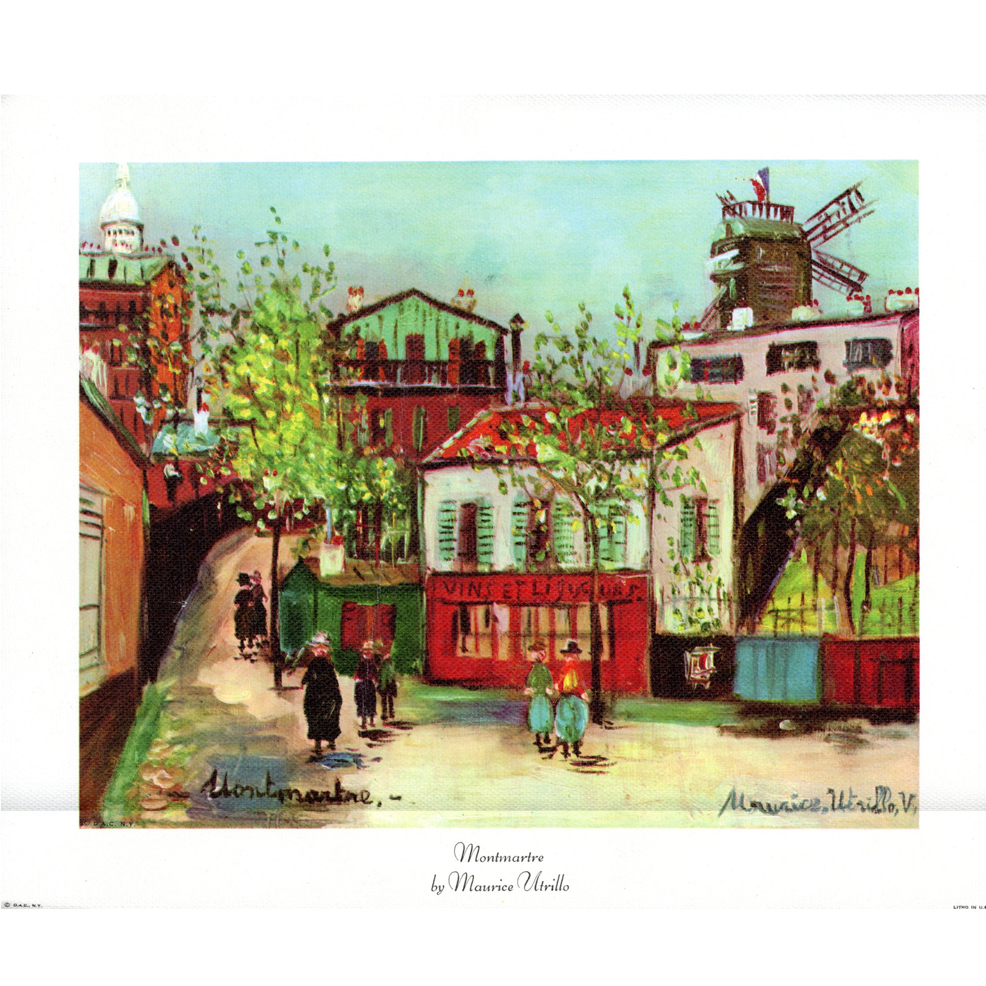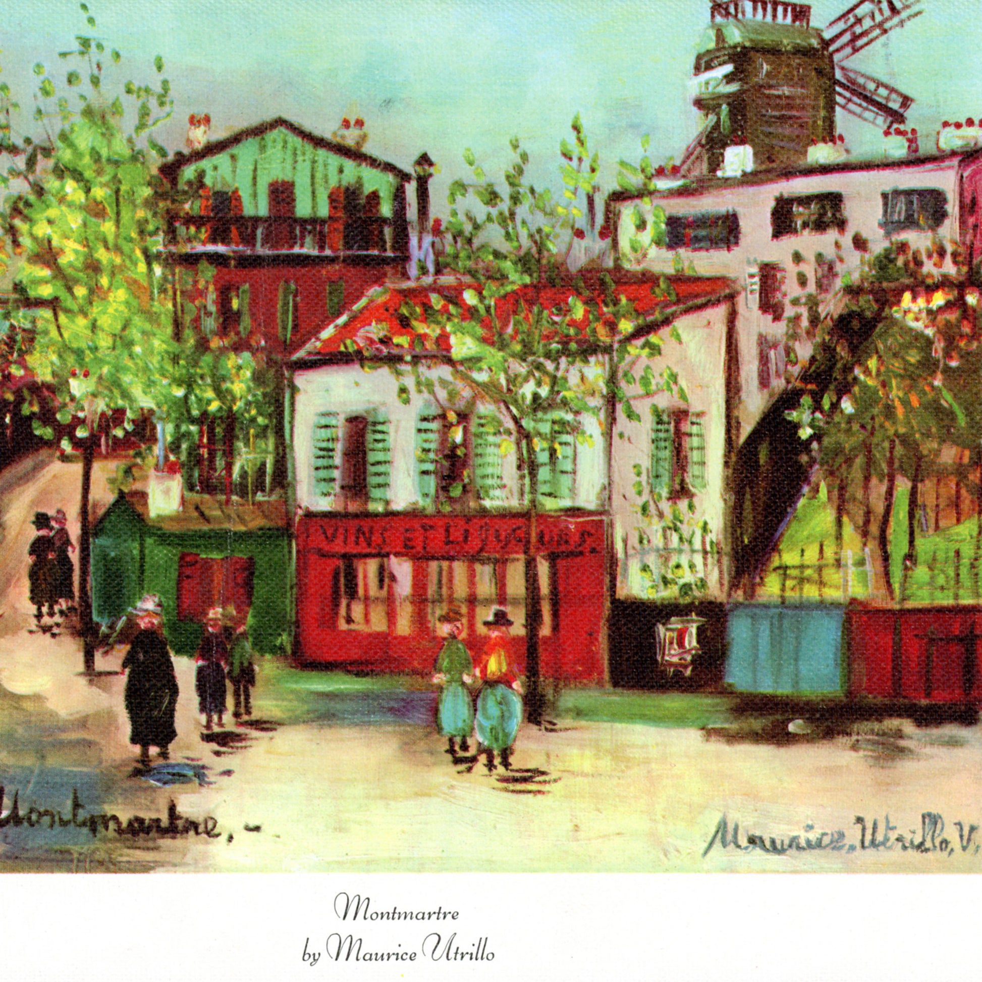 The painting named, Montmartre features a street scene from Montmartre, the 18th arrondissement of Paris with Vins et Liqueurs shop in front.
