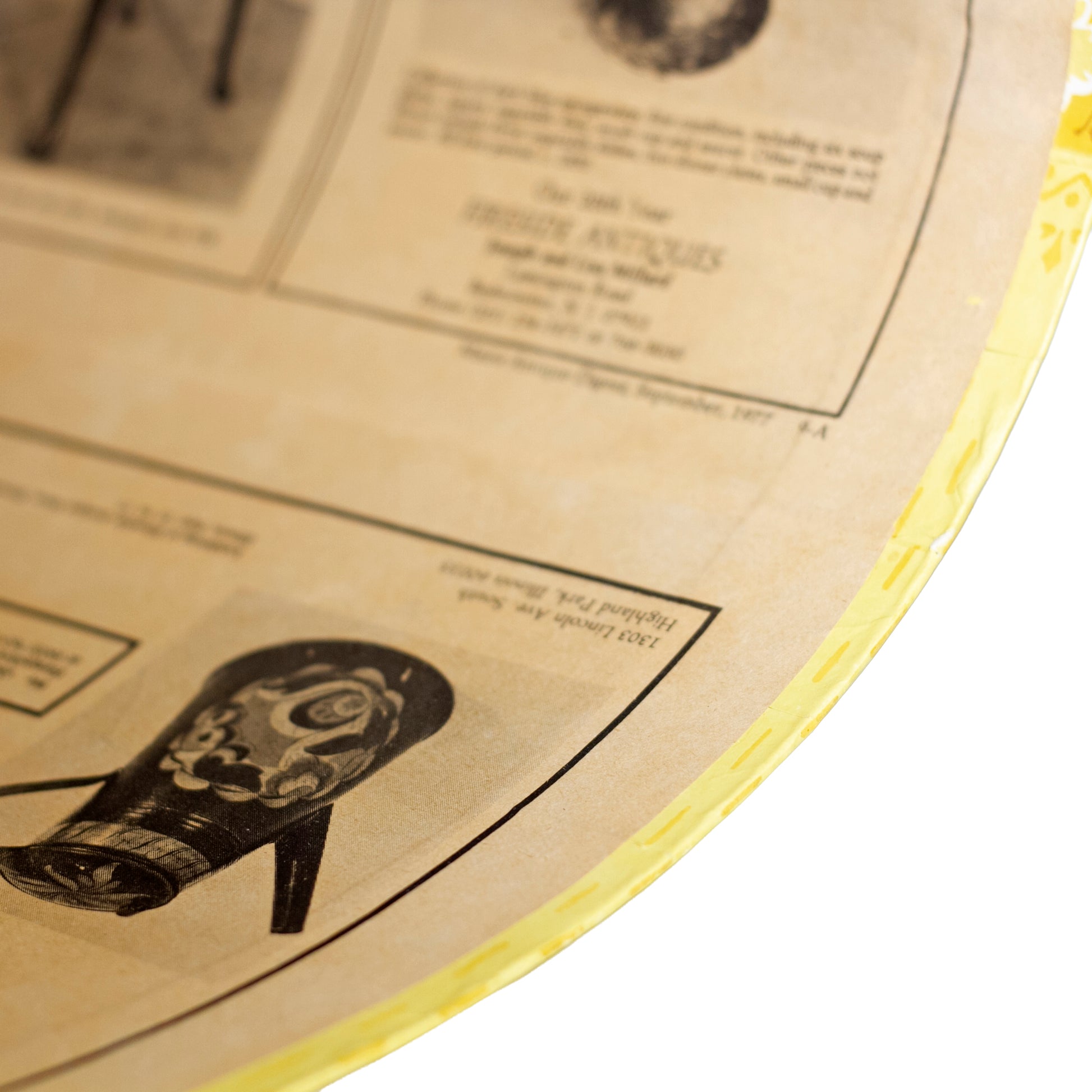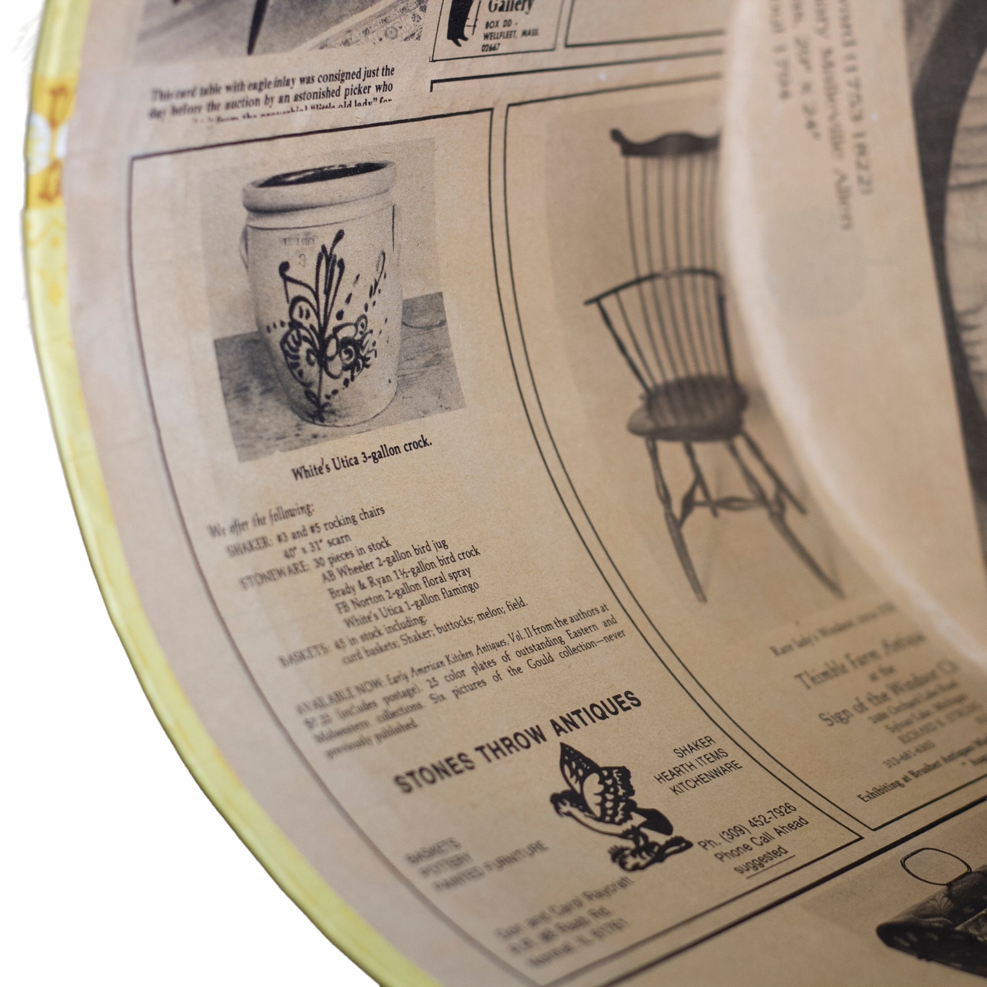 The slightly oval form is covered in beautiful vintage wallpaper featuring a pastoral lamb motif: fluffy sheep grazing in a garden scene with a Colonial-style girl, framed by willow trees and a fence. The tones of soft mustard yellow, light oranges, and earthy browns create a warm, nostalgic glow. For the lining, the interior, bottom, and lid are thoughtfully papered with pages from the Maine Antique Digest, September 1977—adding a layer of antique charm and dating the assembly post-1977.