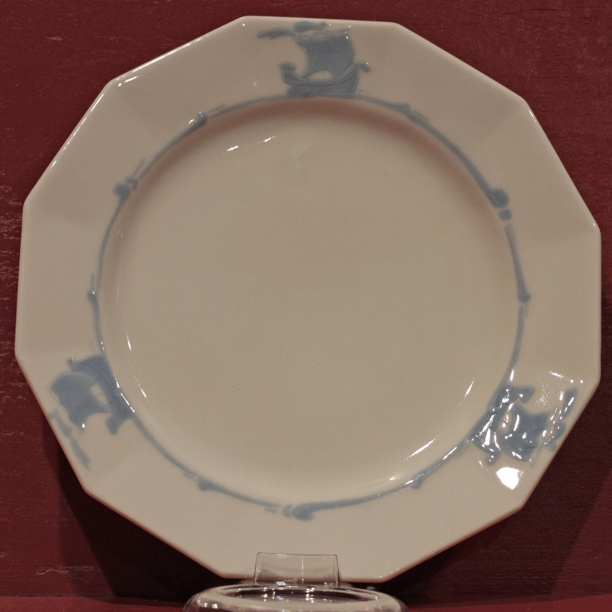 The twelve-sided salad plate is 8” in diameter. The rim is decorated with three sailing ships in light blue.