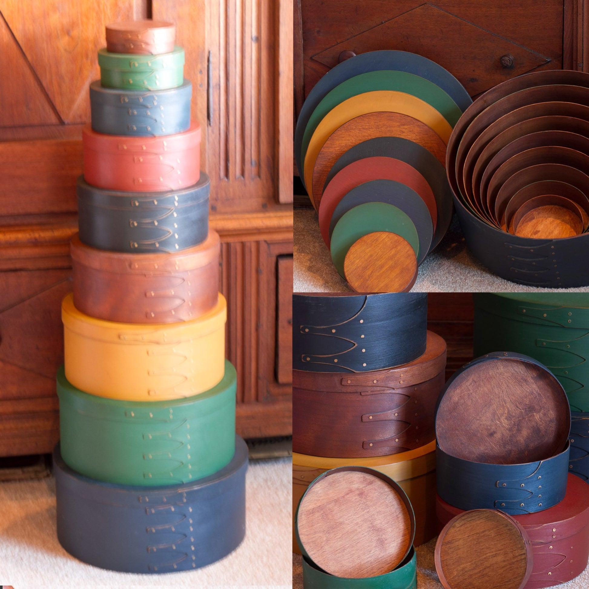 Featuring a complete set of nine (9) STACKING SHAKER-STYLE SWALLOW TAIL JOINTED CIRCULAR NESTING BOXES with matching covers.