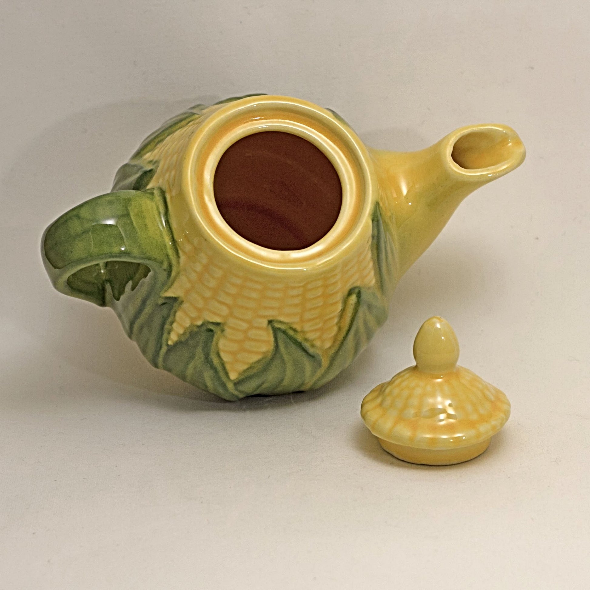 This listing features the hard-to-find SMALL TEAPOT made by SHAWNEE POTTERY COMPANY in the Genuine CORN KING pattern. The bright yellow and green pottery is completely covered with a raised pattern of whimsical buttery yellow corn and earthy green shuck.