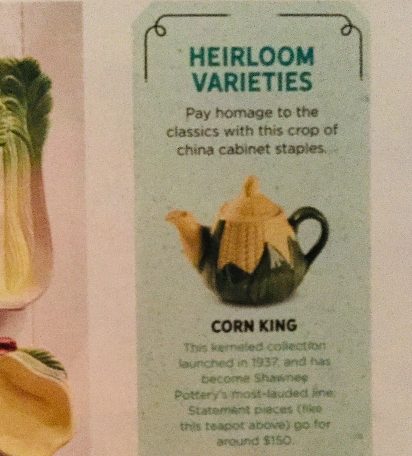 Shawnee Corn Pottery: Shawnee Pottery of Zanesville, Ohio produced three distinct lines of corn ware from 1941 until its dissolution in 1961, the most renowned and sought-after of which was Corn King. Initially released in 1941 as White Corn King with white kernels and dark green husks, the line consisted of seven pieces before being redesigned in 1946 with yellow kernels and lighter green husks, at which point the line was renamed simply Corn King. Upon decreased sales, Shawnee revamped the line in 1954 as Queen Corn, featuring lighter yellow kernels and darker green shucks.