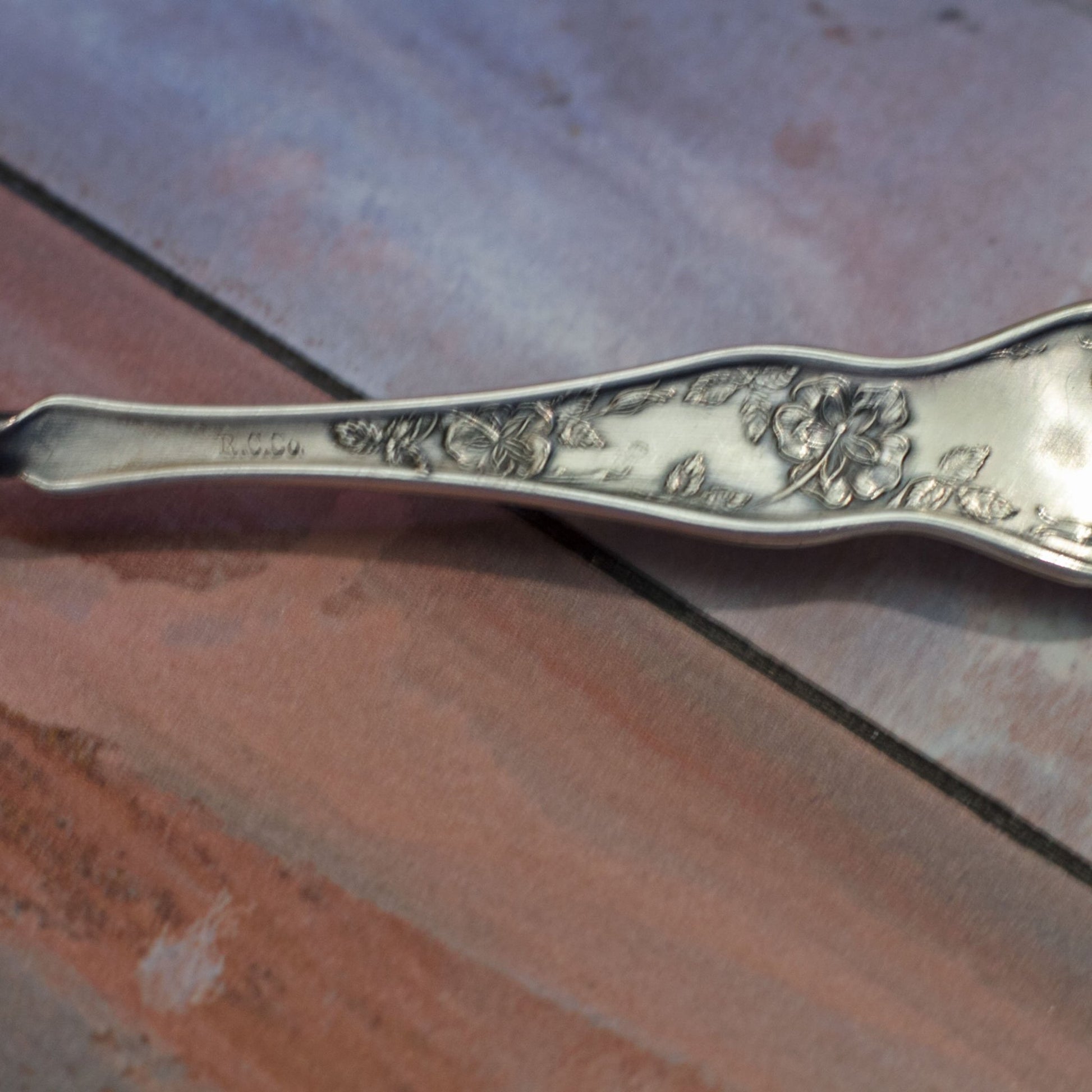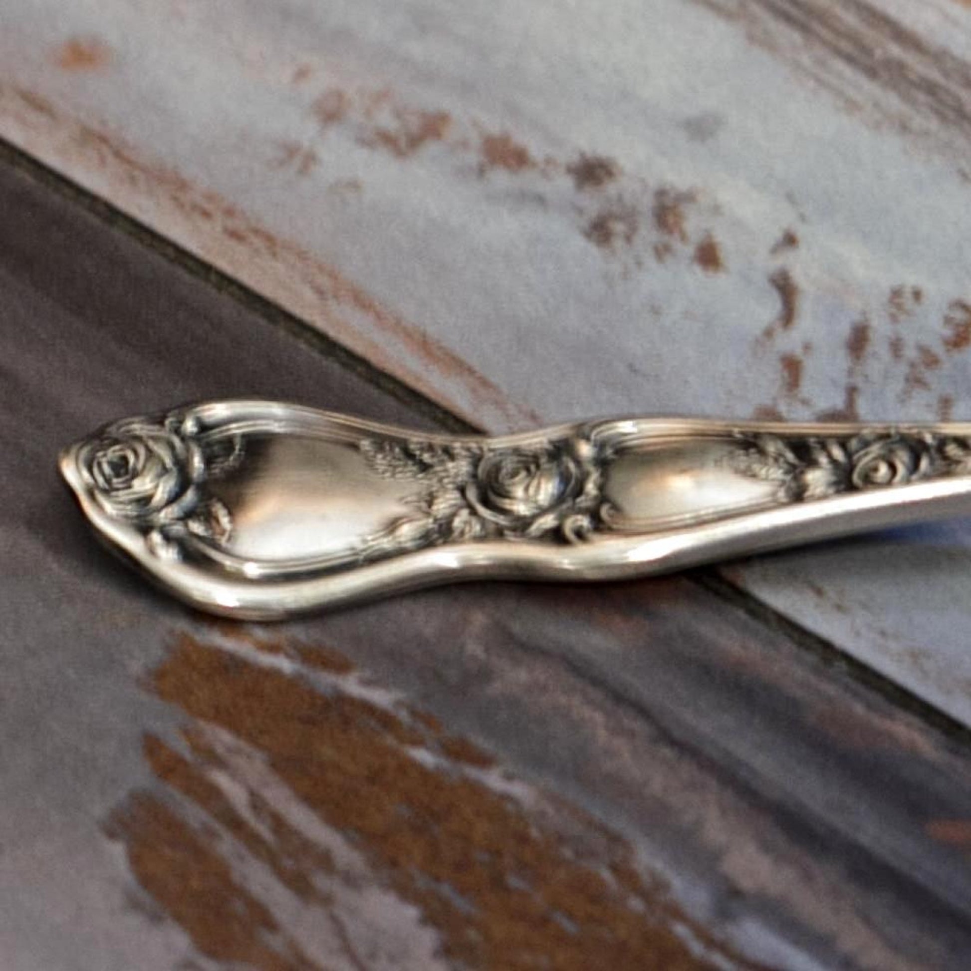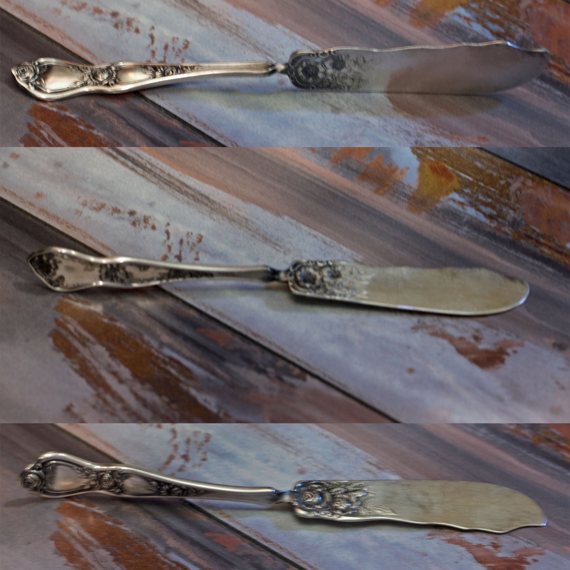 A lovely antique ROSE SILVER PLATE FLAT TWISTED BUTTER KNIFE by Rogers Cutlery. The silver company was founded in 1872 and was one of the original silver companies to form the International Silver Company. The flat twisted handle butter knife is not common and was made to stand upright on the butter plate. Very inventive!