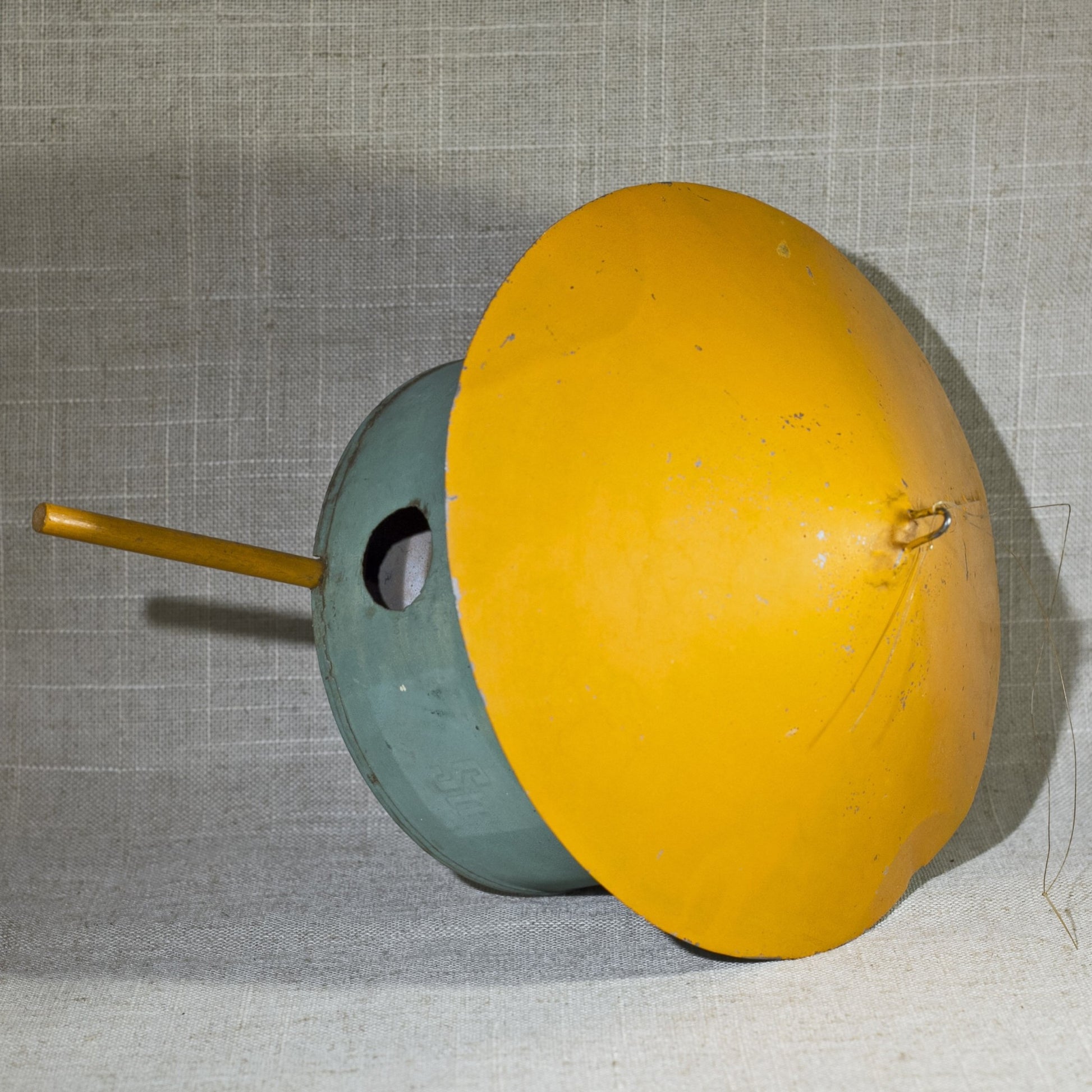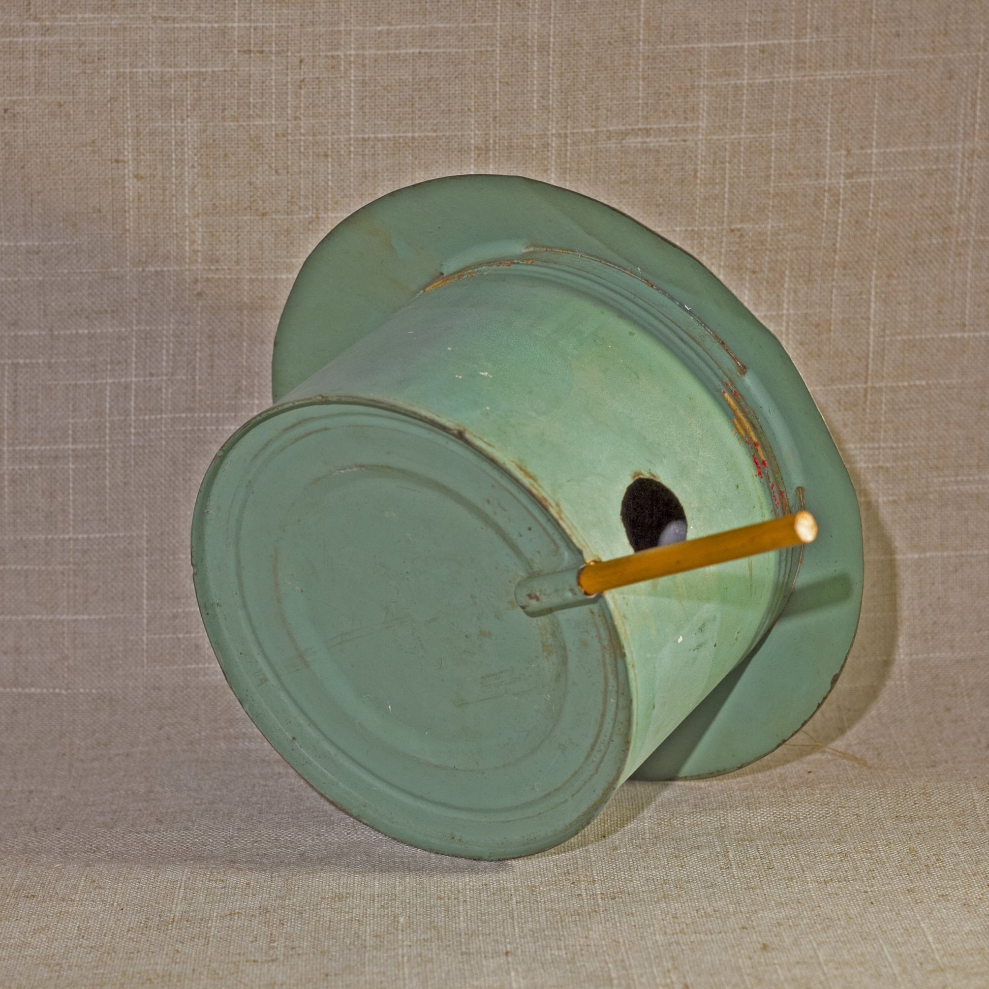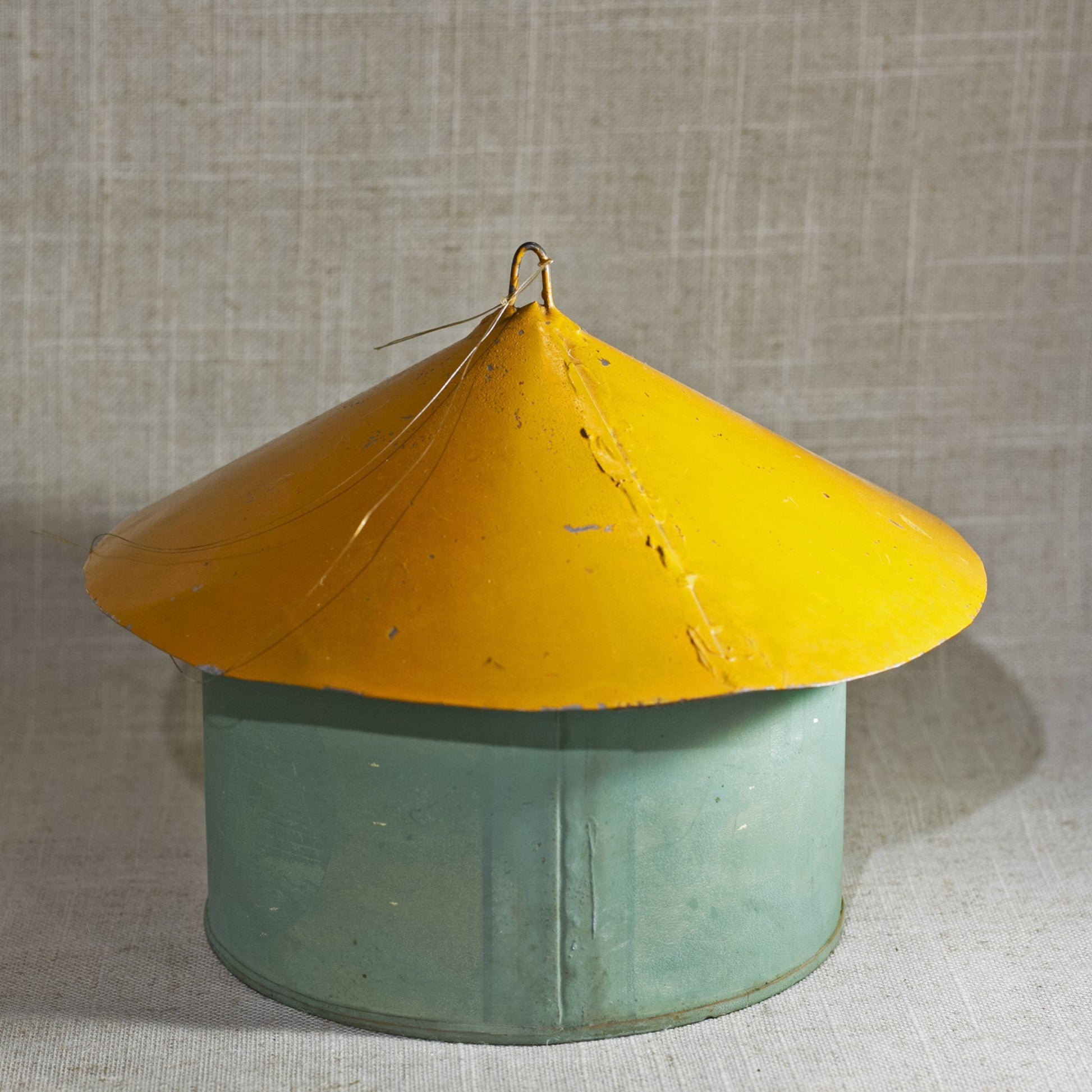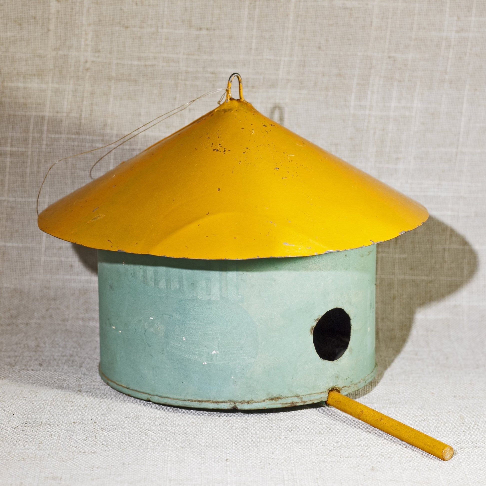 This vintage handcrafted green and orange WREN HOUSE was made from a one-pound STEAMBOAT COFFEE CAN. The Steamboat coffee brand was made Fred W. Hinz & Sons of Cincinnati, Ohio.