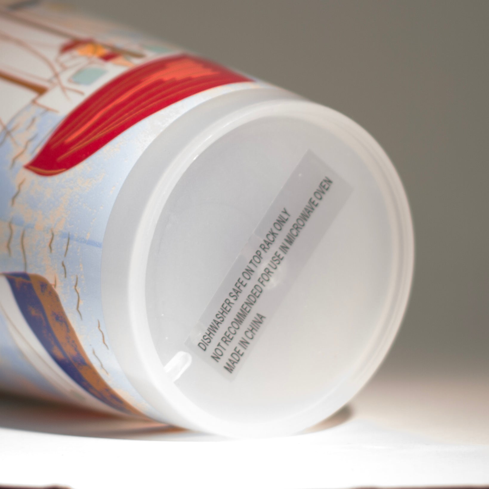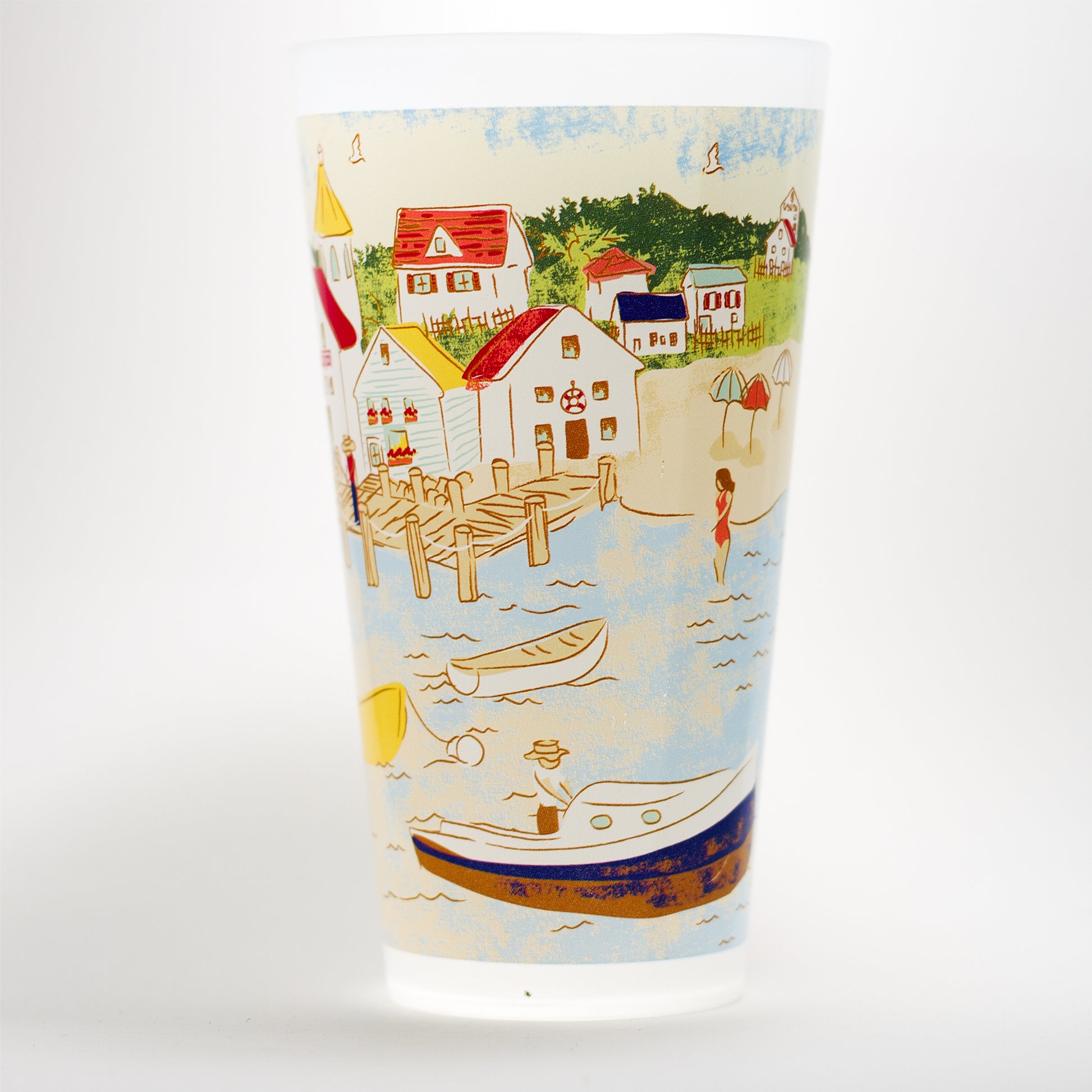Each piece in the set is brightly decorated with a colorful summer scene of the Nantucket Harbor and its typical pier cottages, sailboats, fishing pier and beach. The primary colors used by the artist are red, blue and yellow.