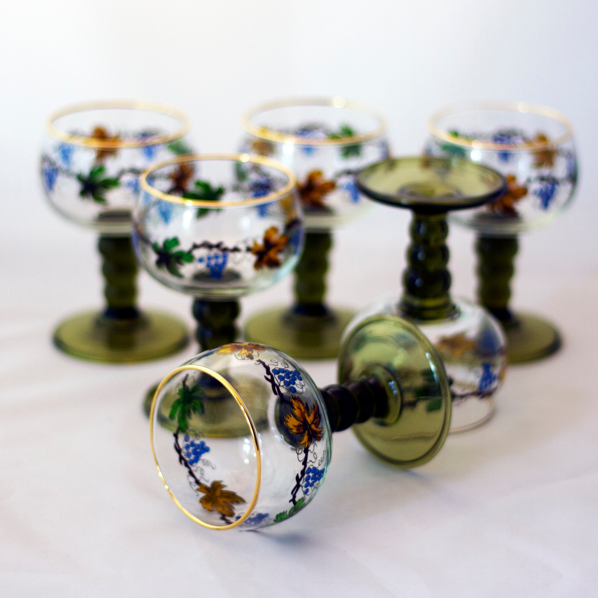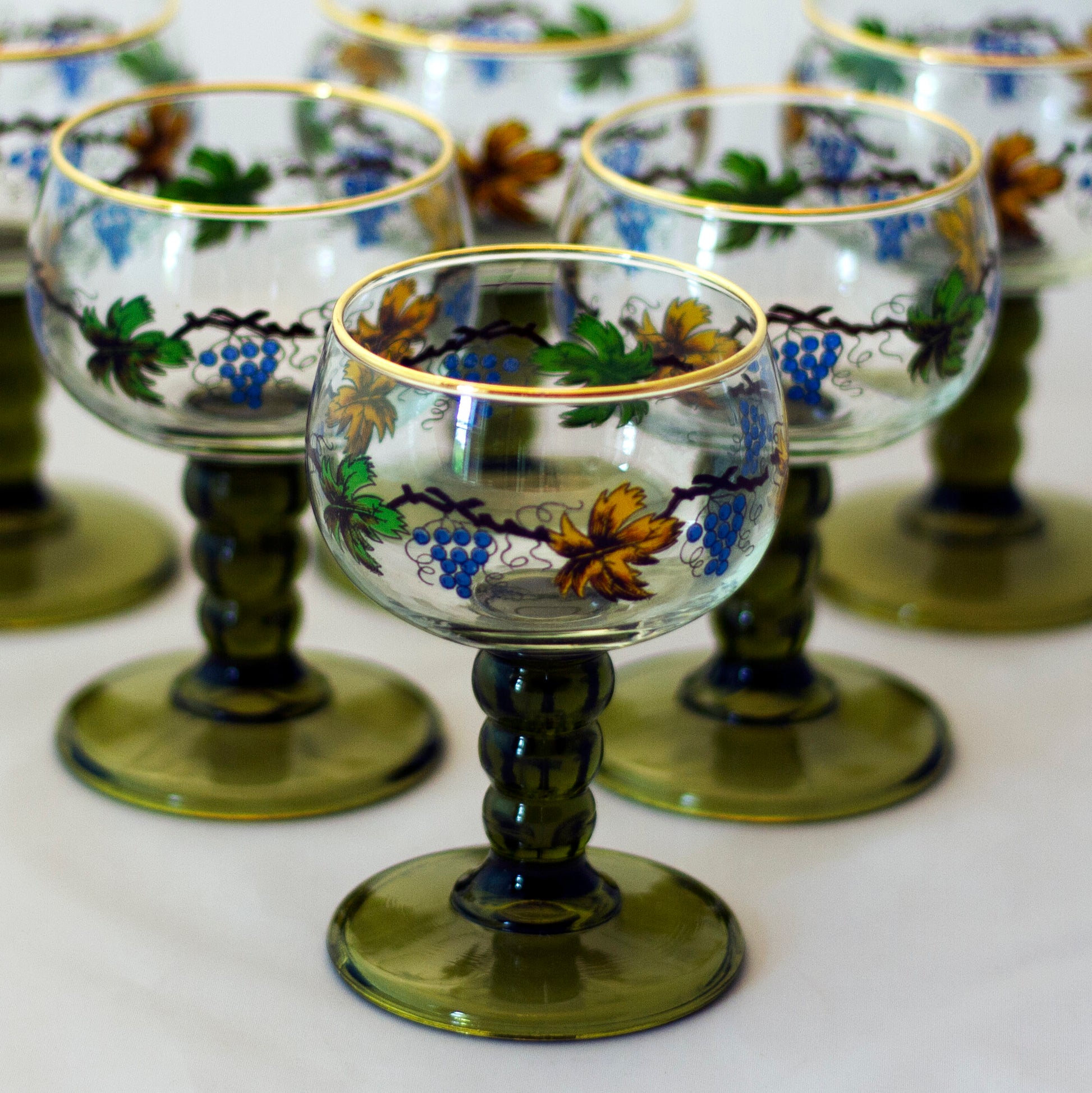 Elevate your glassware collection with this set of 6 vintage Austrian Römer Edelglas wine goblets, each featuring a stunning hand-painted grapevine design. These collectible mid-century goblets are a perfect blend of artistry and function—ideal for entertaining or displaying in your vintage barware collection.